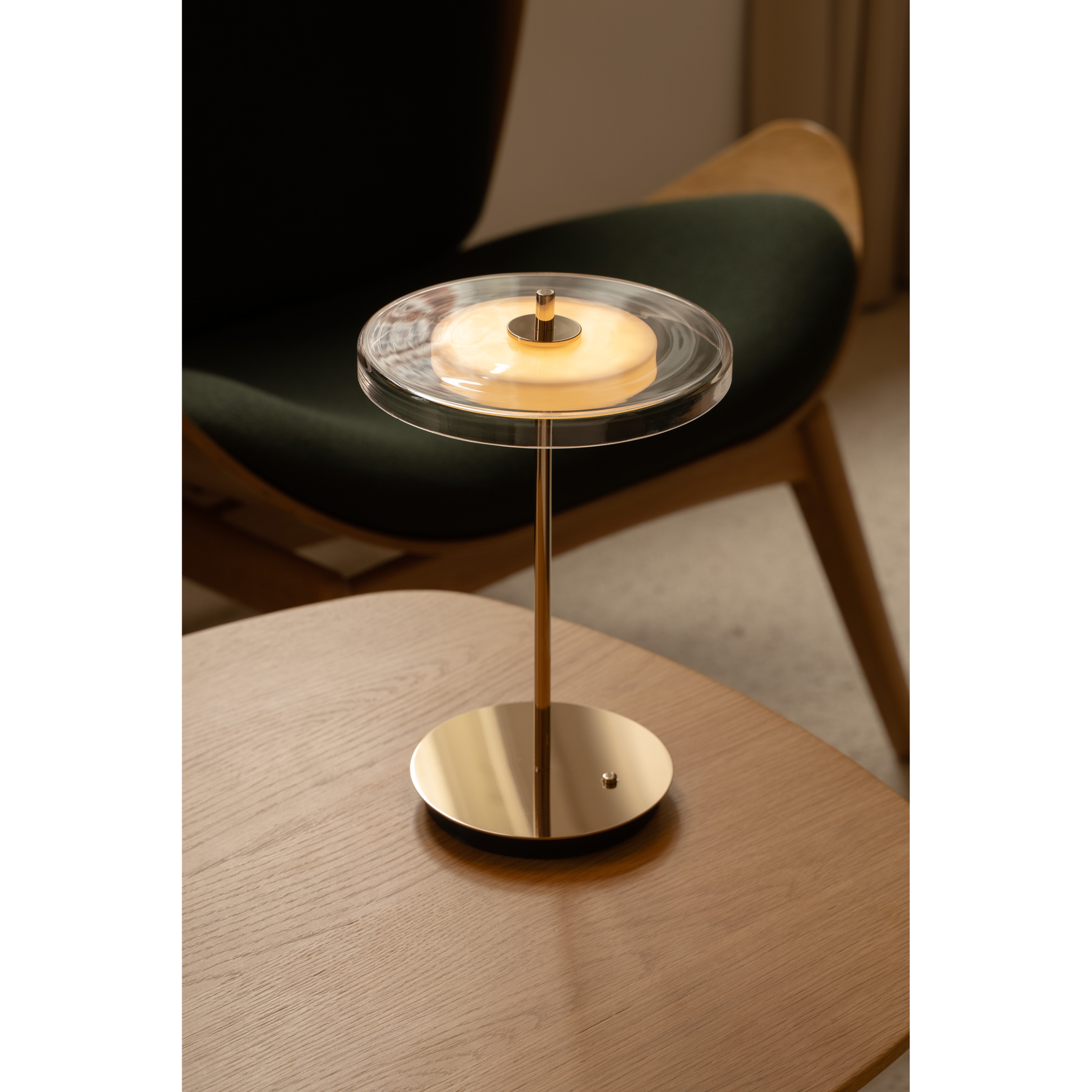 Modellen har integreret LED‑panel og fire trinbare lysniveauer, så du nemt kan justere fra blødt hyggelys til mere funktionelt læselys. Lampen er genopladelig og trådløs, hvilket giver frihed til at flytte den rundt i hjemmet eller tage den med udendørs (hvor brugen tillades). Messingfinishen tilfører varme og eksklusivitet, mens glasbeklædningen giver et let og luftigt visuelt udtryk.