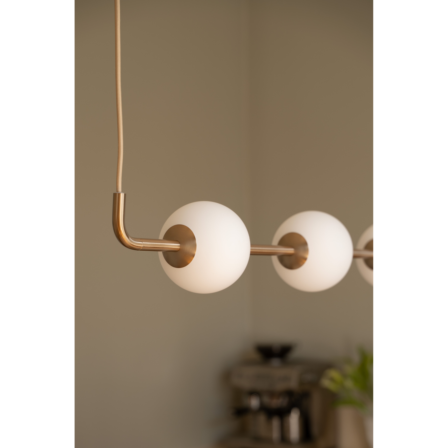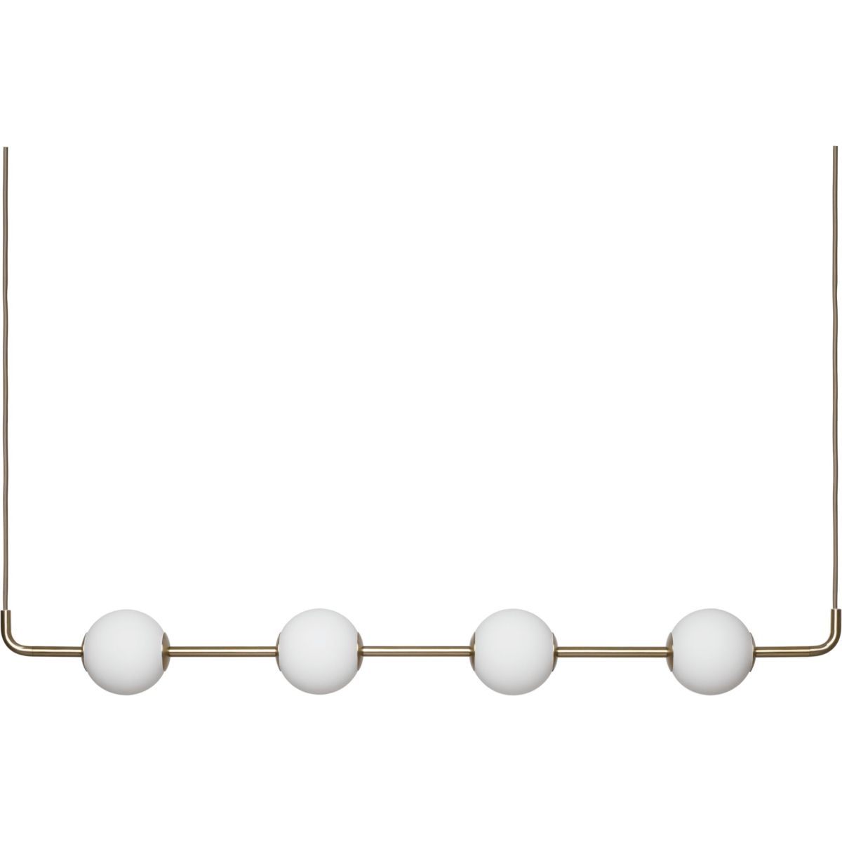Modellen leverer blødt, diffust lys gennem opalglaselementerne og passer ideelt som samlingspunkt i indretningen. Messingfinishen tilfører varme og luksuriøsitet, mens det lange ophæng gør lampen til et centralt blikfang uden at dominere rummet. Den kan anvendes over bordet eller i kombination med flere lamper i række for et sammenhængende designudtryk.
