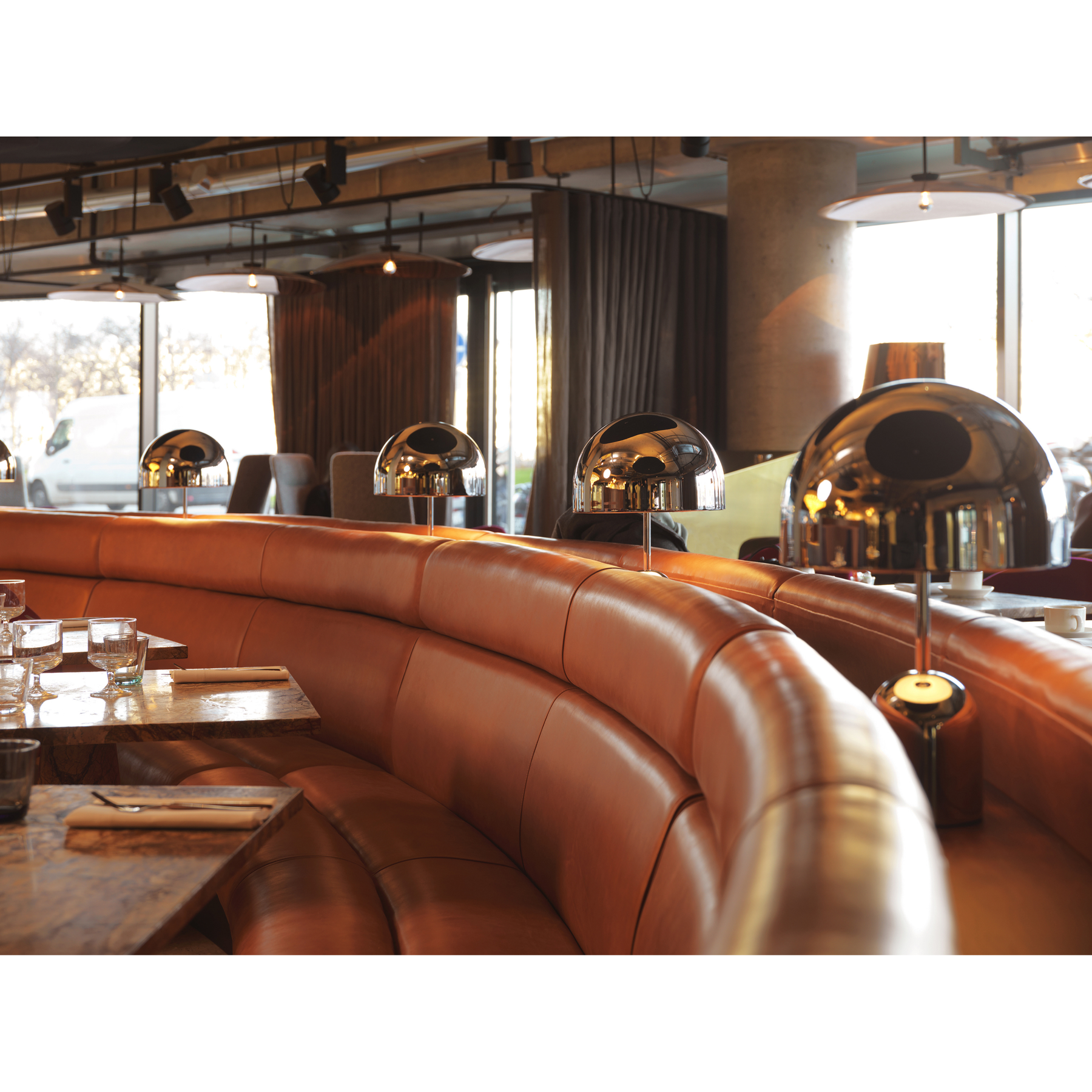Lampens kuppel og base er udført i højkvalitets presset metal/plast med en poleret guldfinish. Den glatte overflade reflekterer omgivelserne smukt og giver lampen et skulpturelt udseende. Designet er minimalistisk og moderne uden synlige samlinger, hvor form og funktion smelter sammen.