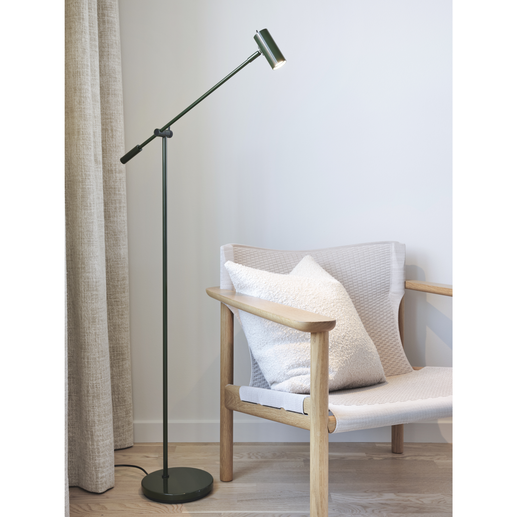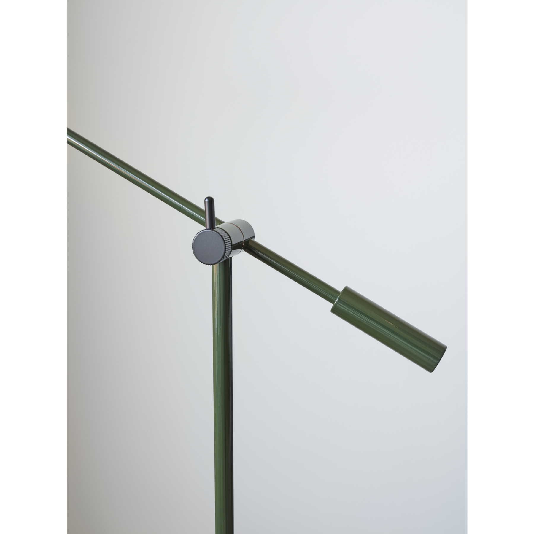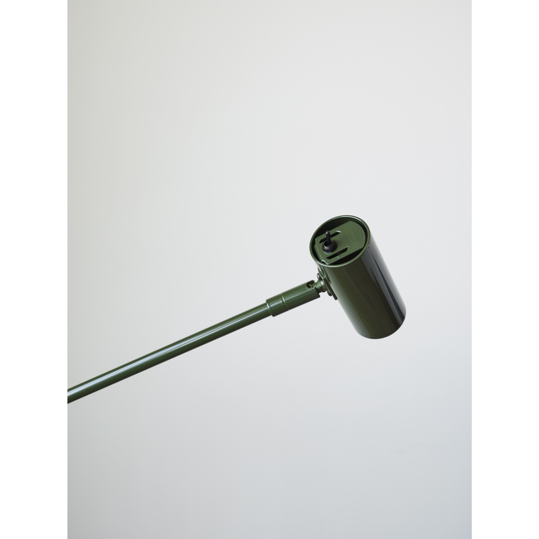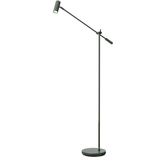 Cato gulvlampen er fremstillet i metal med en mat skovgrøn overflade og sorte detaljer, hvilket giver et moderne og stilrent udtryk. Den høje stander og den fleksible arm gør det muligt at justere lampens position, så den passer perfekt til dine behov. Lampens enkle, men karakteristiske form gør den til et kunstværk i sig selv.
