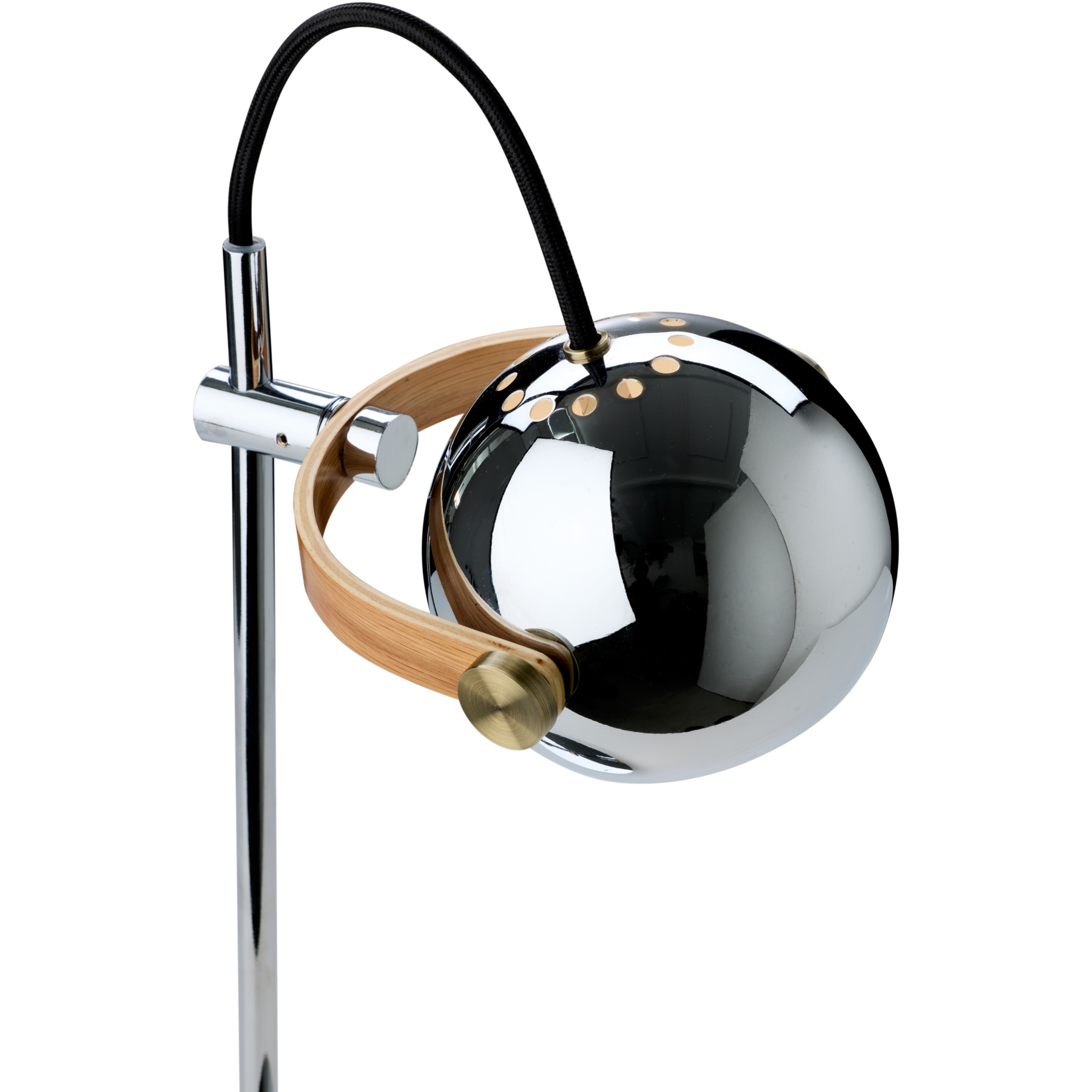 Lampen er fremstillet i metal med en krom-finish og detaljer i valnøddetræ, hvilket giver et elegant og holdbart udtryk. Den har en højde på 35 cm og en diameter på 12 cm, hvilket gør den nem at placere på natbord, skrivebord eller som stemningsbelysning i stuen. Den indbyggede LED-lyskilde afgiver et varmt hvidt lys (2700 K), der skaber hyggelig atmosfære.