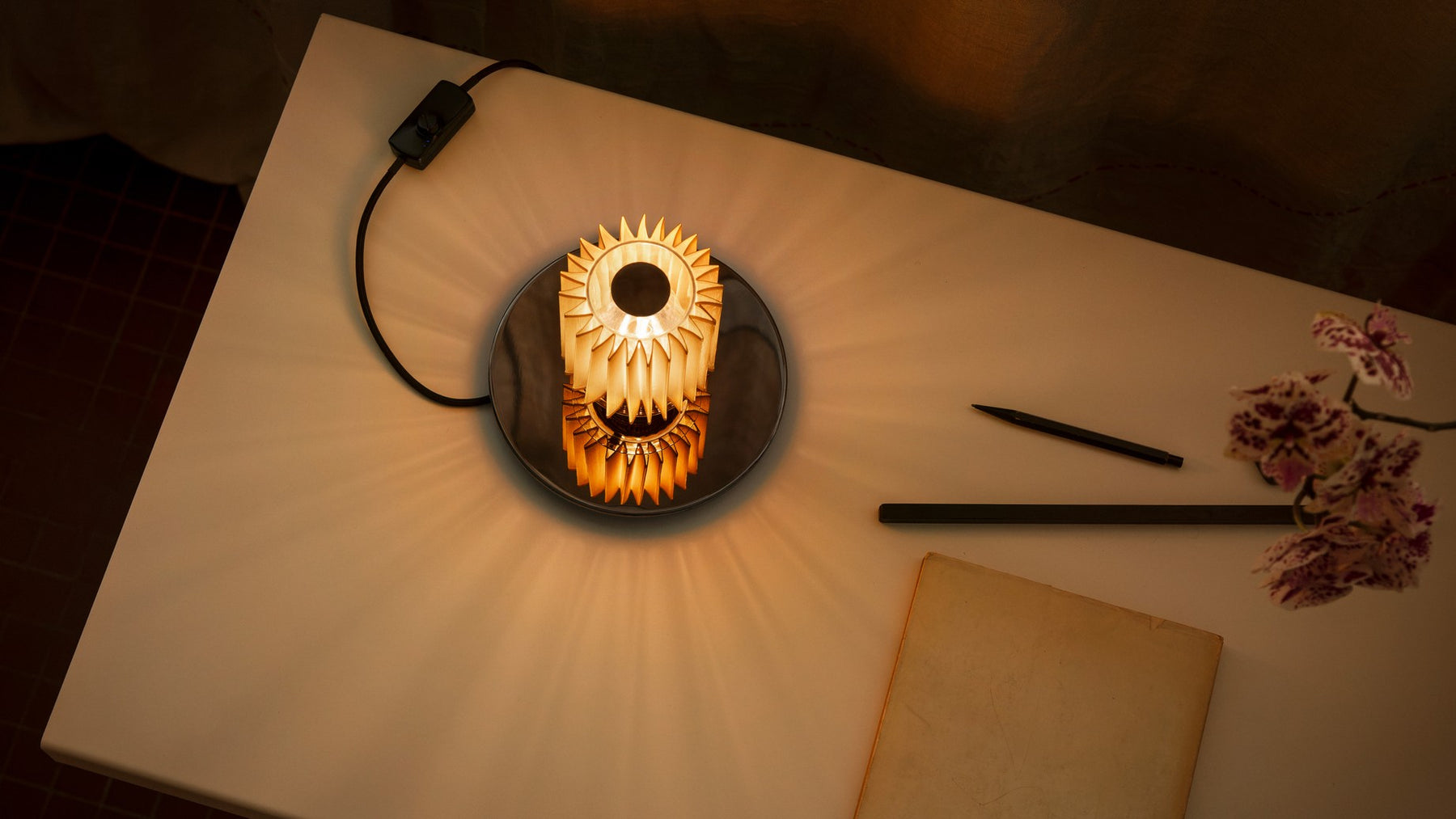 In The Sun 220 fra DCWéditions er et elegant bordlampeobjekt, der forener arkitektonisk præcision og luksuriøse materialer i en kompakt og raffineret form. Designet af Dominique Perrault & Gaëlle Lauriot‑Prévost, lampen tager sin inspiration fra det store reflektor-arbejde ved Pavillon Dufour i Château de Versailles, og omsætter arkitekturens lys og skygge til boligbelysning.