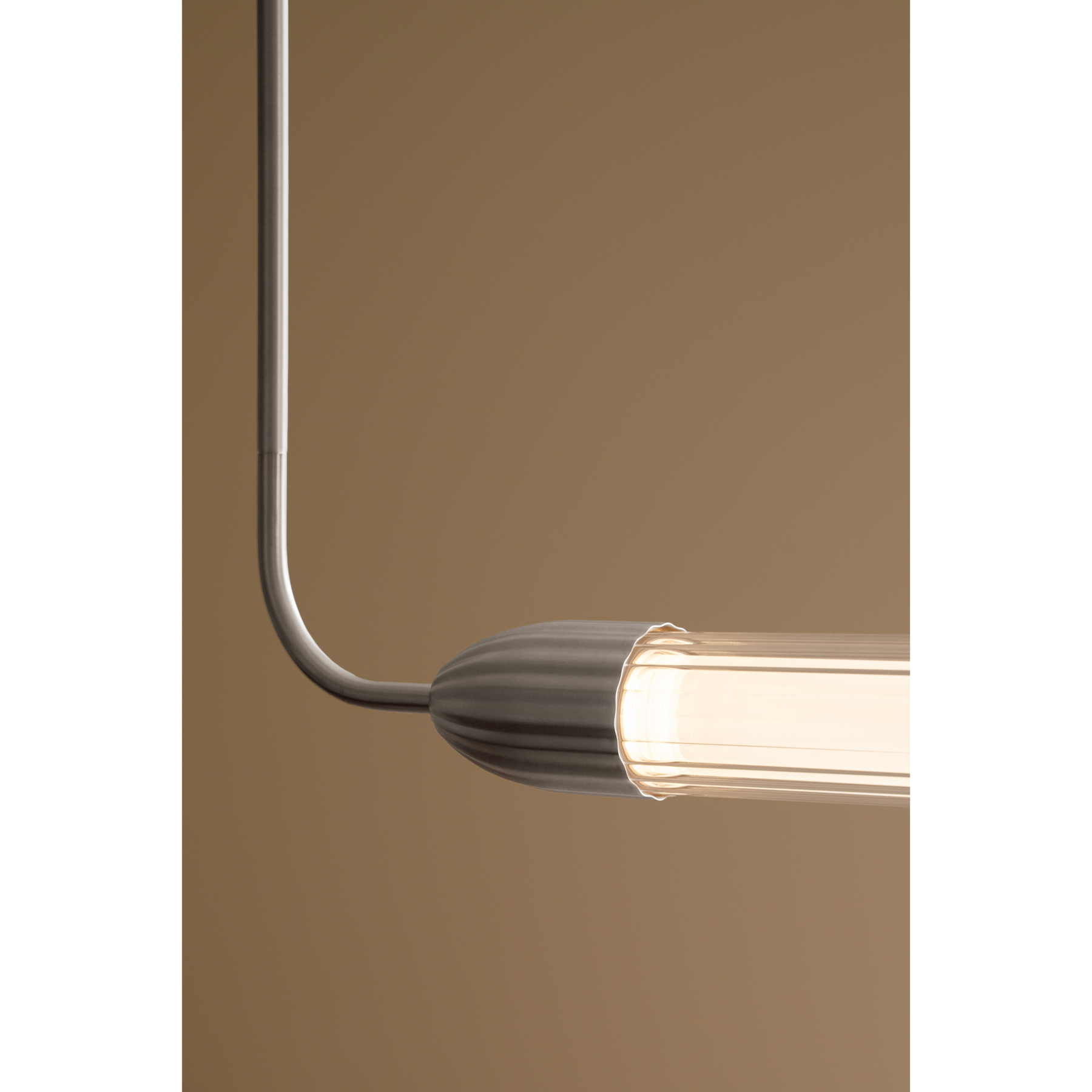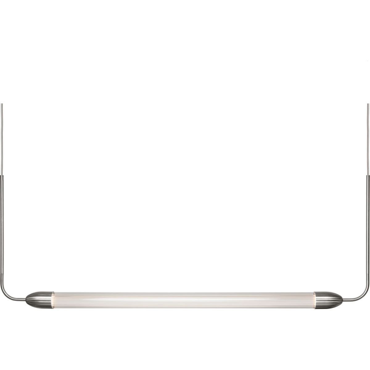 Pendlen er fremstillet med materialer som stål, glas og PMMA. Den lange form – typisk omkring 200 cm i længde – giver et markant, men samtidig let og luftig udtryk. Den stålgrå finish understøtter et moderne og tidløst udtryk, som passer ind i minimalistiske og nordiske hjem.