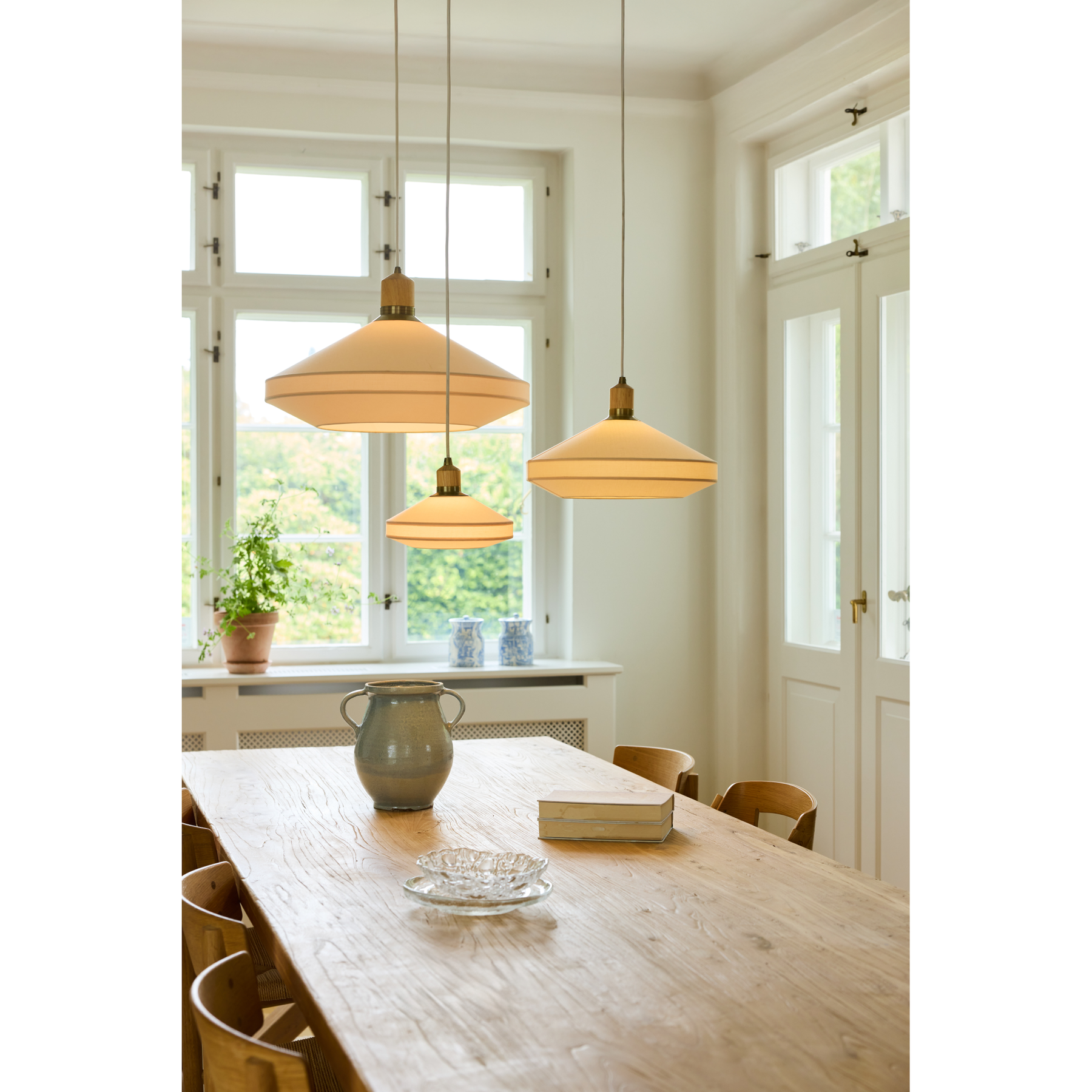 Lampeskærmen er udført i eksklusivt tekstil i en smuk cremefarve, der giver et roligt og sofistikeret udtryk. Med en diameter på 24 cm og en højde på cirka 17 cm har pendlen en harmonisk størrelse, der passer ind i de fleste hjem. Den leveres med en matchende stofledning, som fuldender det elegante design.