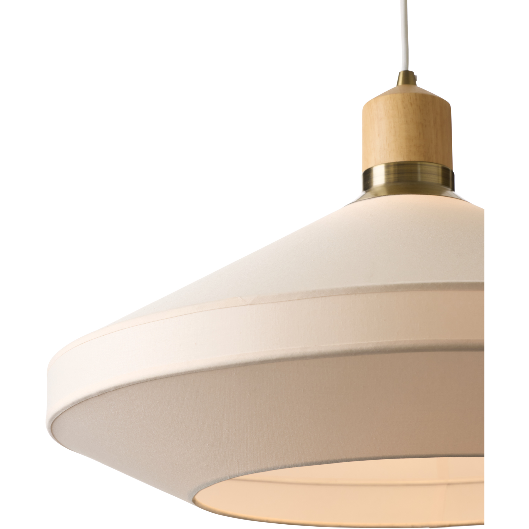 Pendlen er fremstillet med tekstilskærm i cremefarve, kombineret med metal og let trædetaljer som skaber et eksklusivt og samtidigt luftigt udtryk. Med en diameter på 72 cm og højden cirka 40 cm får lampen en stor tilstedeværelse men bevarer samtidig et elegant formsprog. Det stofbelagte kabel giver fleksibel ophængning og støtter det bløde udtryk.