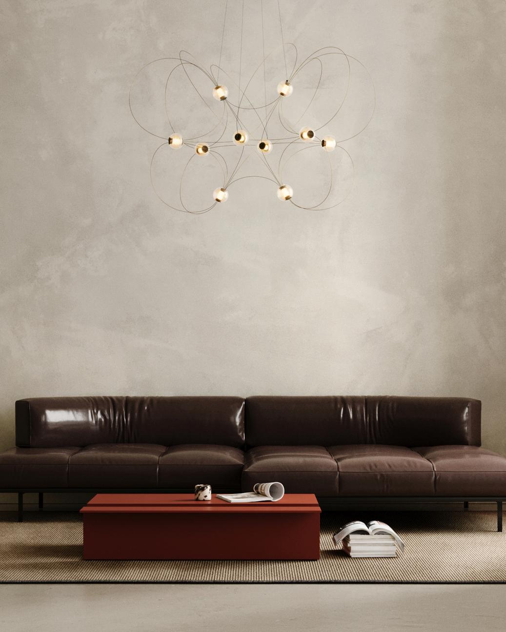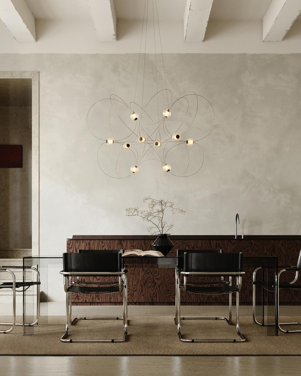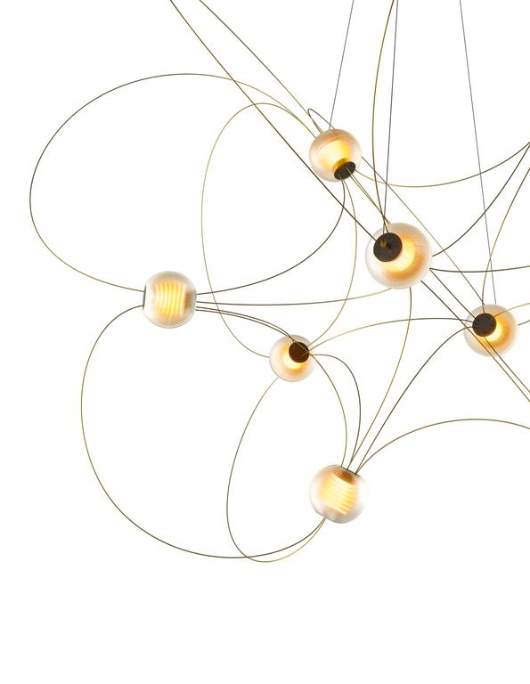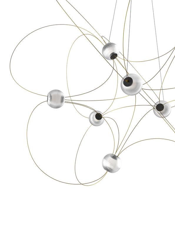 Den varme guldfinish reflekterer lyset svagt og tilfører rummet et luksuriøst præg. Lampens store dimensioner gør den ideel til at hænge som et kunstnerisk element — enten alene eller i kombination med andre lamper for at skabe rumlig rytme og harmoni. Samtidig har den tekniske specifikationer som dæmpbar LED og mulighed for stor ophængslængde, som sikrer, at design ikke går på kompromis med funktion.