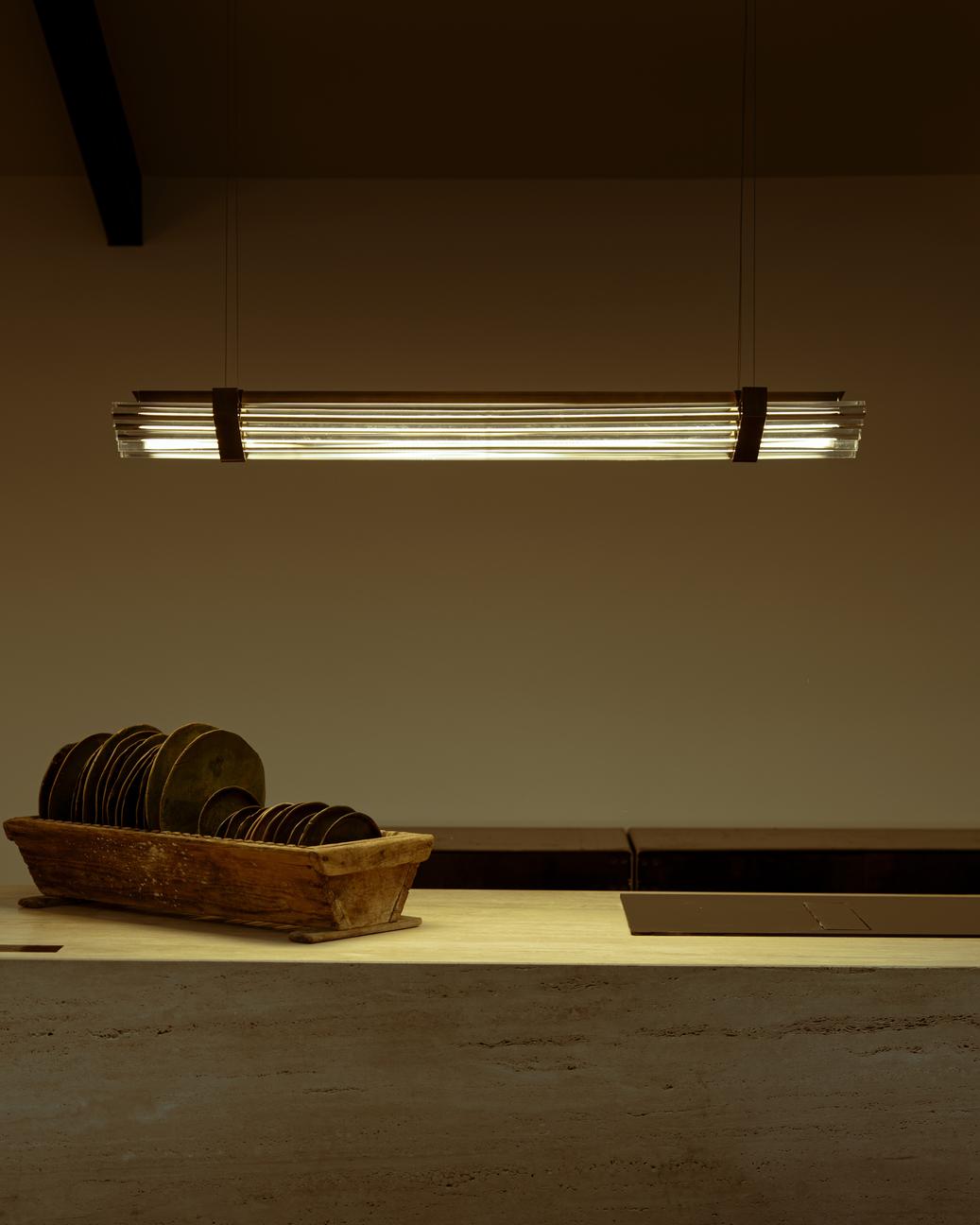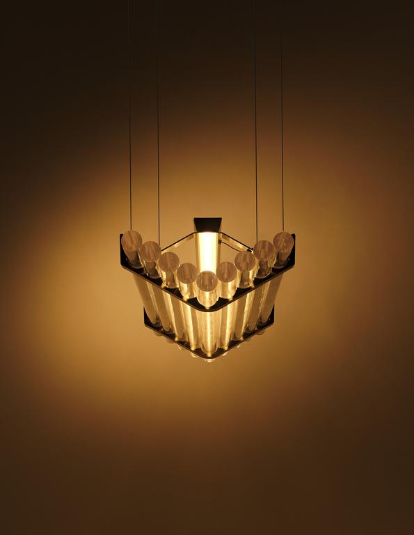 Pendlen er fremstillet i aluminium, stål og akryl med en varm bronzecoating, der giver dybde og glød. Konstruktionen består af ni tonerør, arrangeret i en lang, vandret formation, som kombinerer teknisk præcision med et poetisk formsprog inspireret af himlens bevægelige linjer.