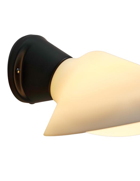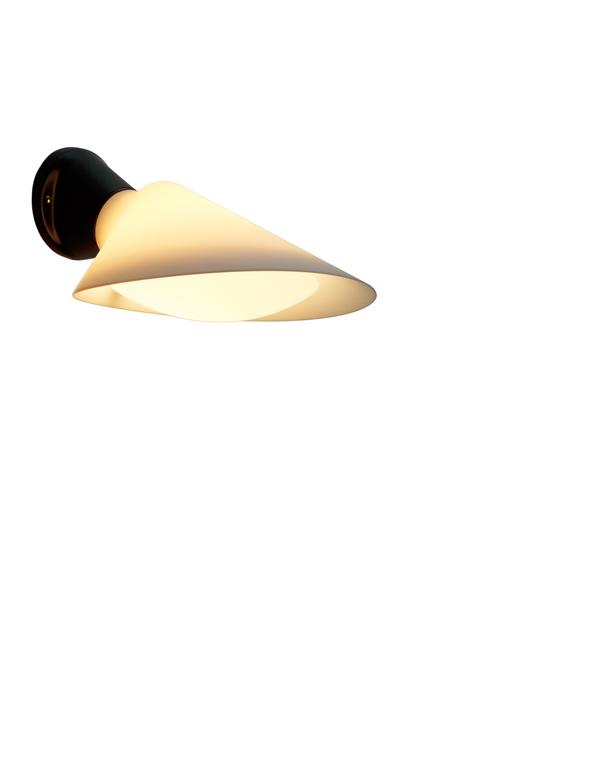 Vægbeslaget er af sortlakeret aluminium, og lampeskærmen er robust polycarbonat. Den asymmetriske skærm med bred åbning i bunden giver et effektivt lysudkast og et visuelt let, skulpturelt udtryk. Designet er moderne og minimalistisk.
