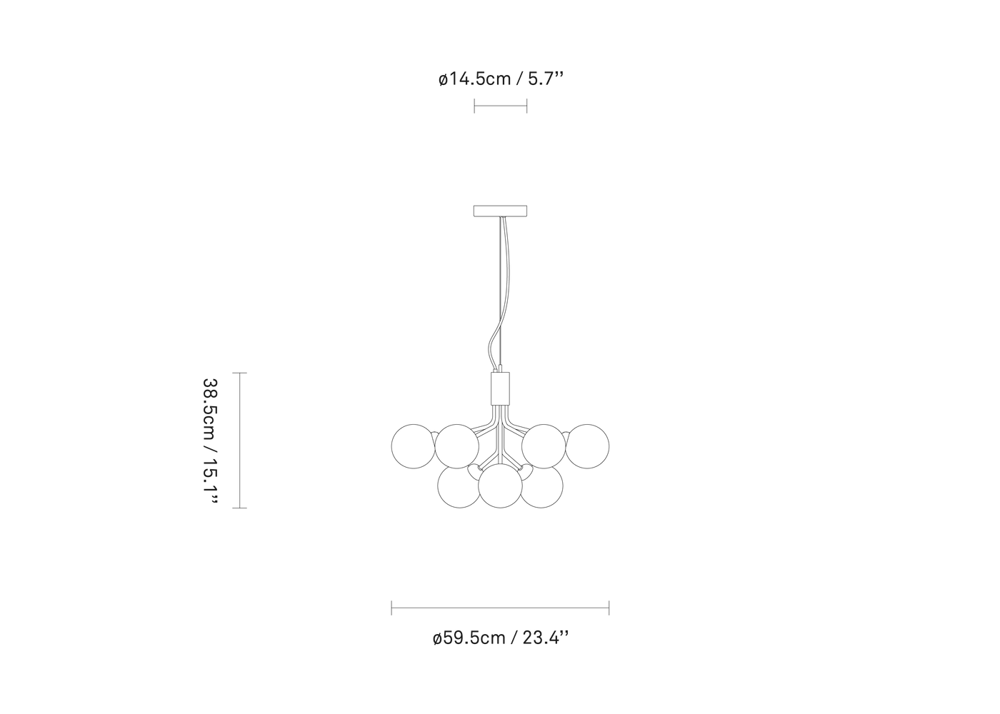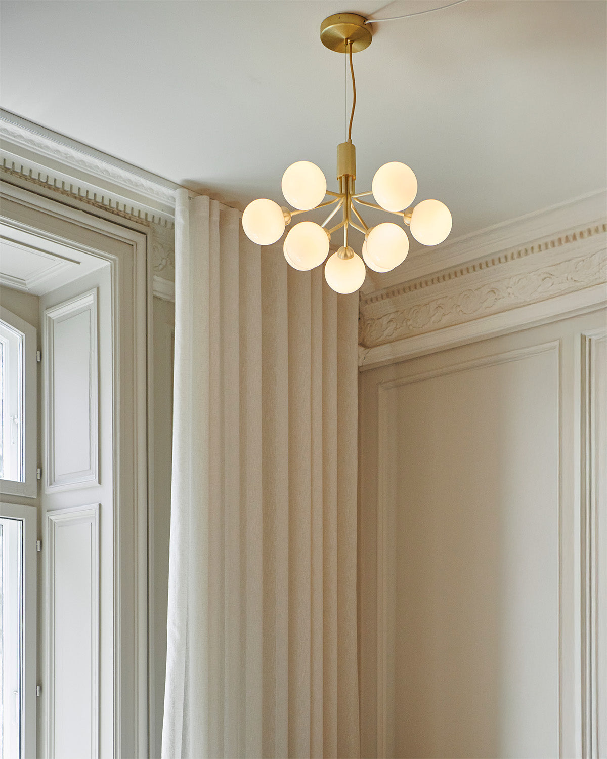 Med ni glaskupler, der fremstår som blomsterhoveder på stængler i messing, bliver lampen et visuelt fokuspunkt i rummet – ideel over spisebordet, i en entré med højt til loftet eller som centralt element i loungeområdet. Messing-farven tilfører varme og elegance, mens de opalhvide glas afbøder lyset og frembringer en blød, jævn glød.