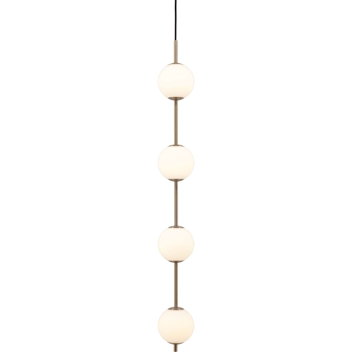 UMAGE Audrey 4 Pendel i messing og opalglas skaber et eksklusivt og sofistikeret udtryk. Med fire glober arrangeret i en vertikal linje giver lampen et markant designudtryk, som passer perfekt i rum med højt til loftet eller over spisebordet, hvor både funktion og stil skal gå op i en højere enhed.