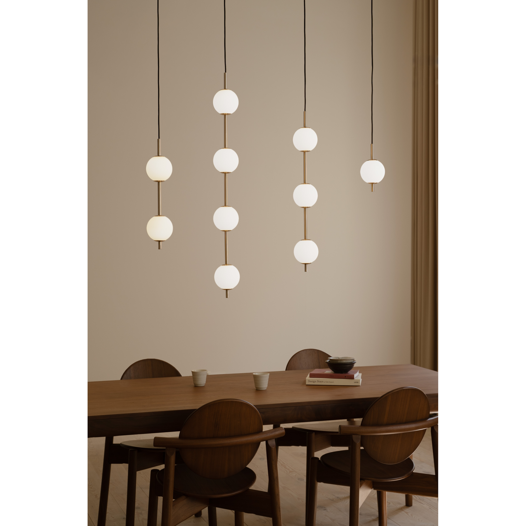 Pendlen er udført med detaljer i messingfinish og glober i mundblæst opalglas, der spreder lyset blødt og jævnt. Den slanke diameter på ca. Ø 12 cm og en højde omkring 100 cm gør modellen visuelt let, men stadig markant. Serien er designet af Søren Ravn Christensen.