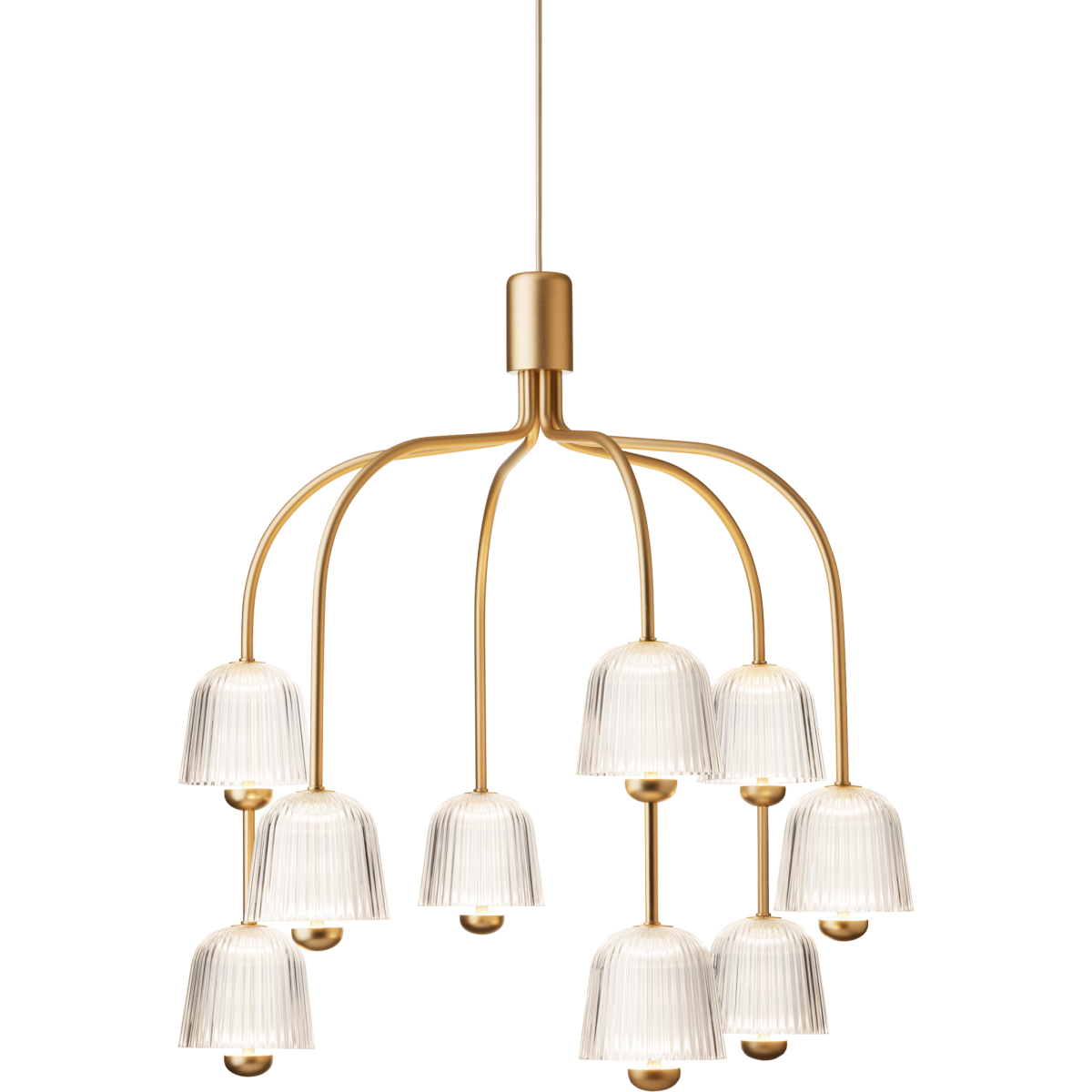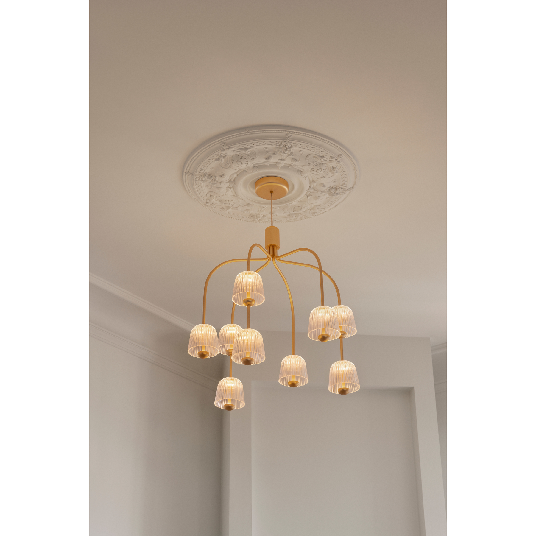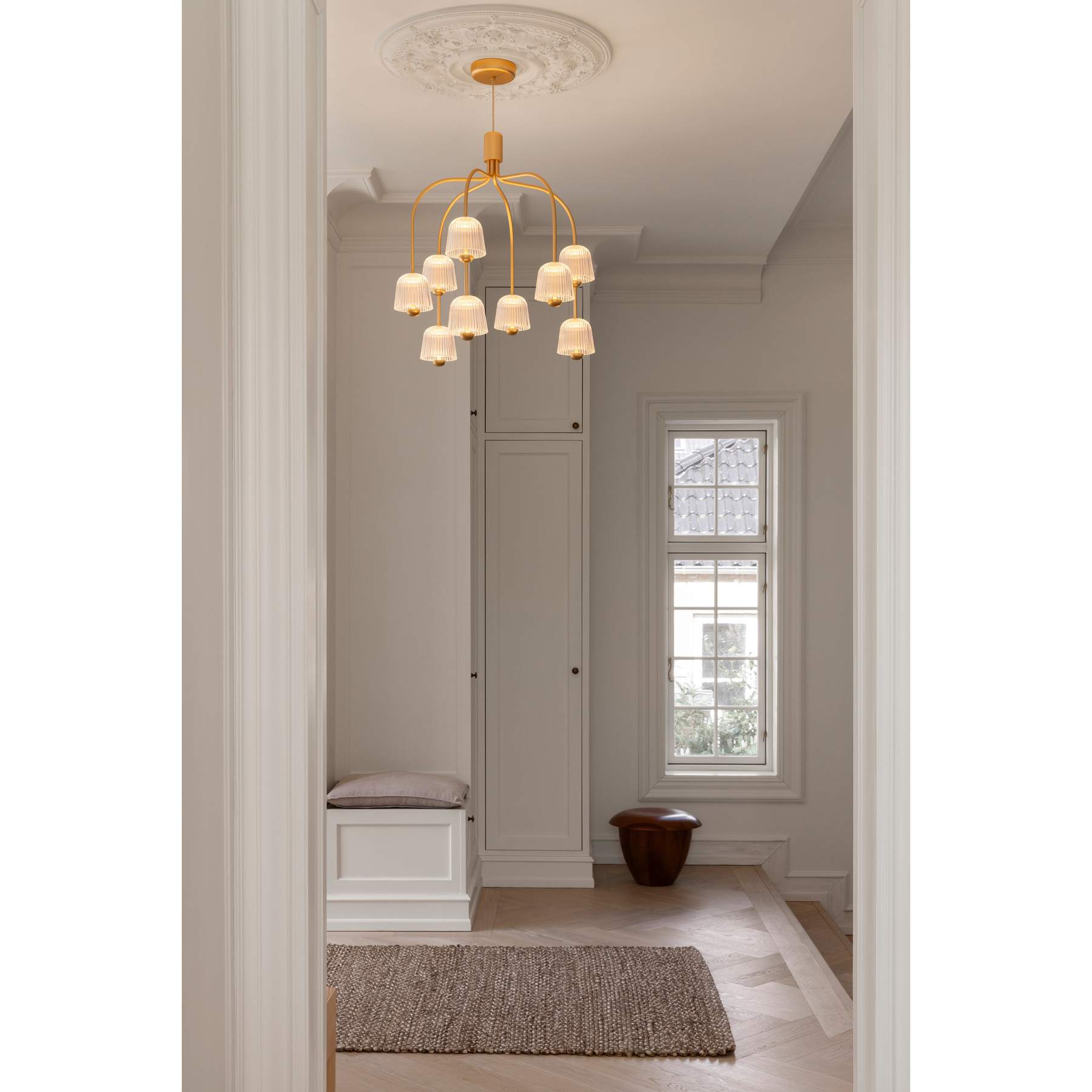 Asteea 9 Pendel er velegnet i store rum med højt til loftet, som entré, stue eller over et stort spisebord. Satin messing-finishen og de riflet akrylskærme fungerer godt i både moderne nordiske og mere klassiske indretninger, især hvor træ, beton eller mørke vægge indgår. Lampens visuelle størrelse gør, at den fungerer som både belysning og kunstobjekt.