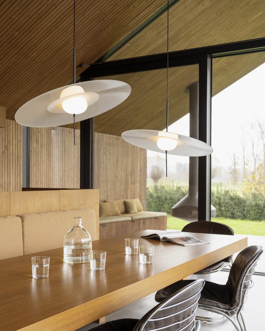 Lampens materialer — aluminium og opalin glas — kombineret med et rent formsprog, gør den velegnet til moderne, stilrene indretninger, hvor design og stemning går hånd i hånd.