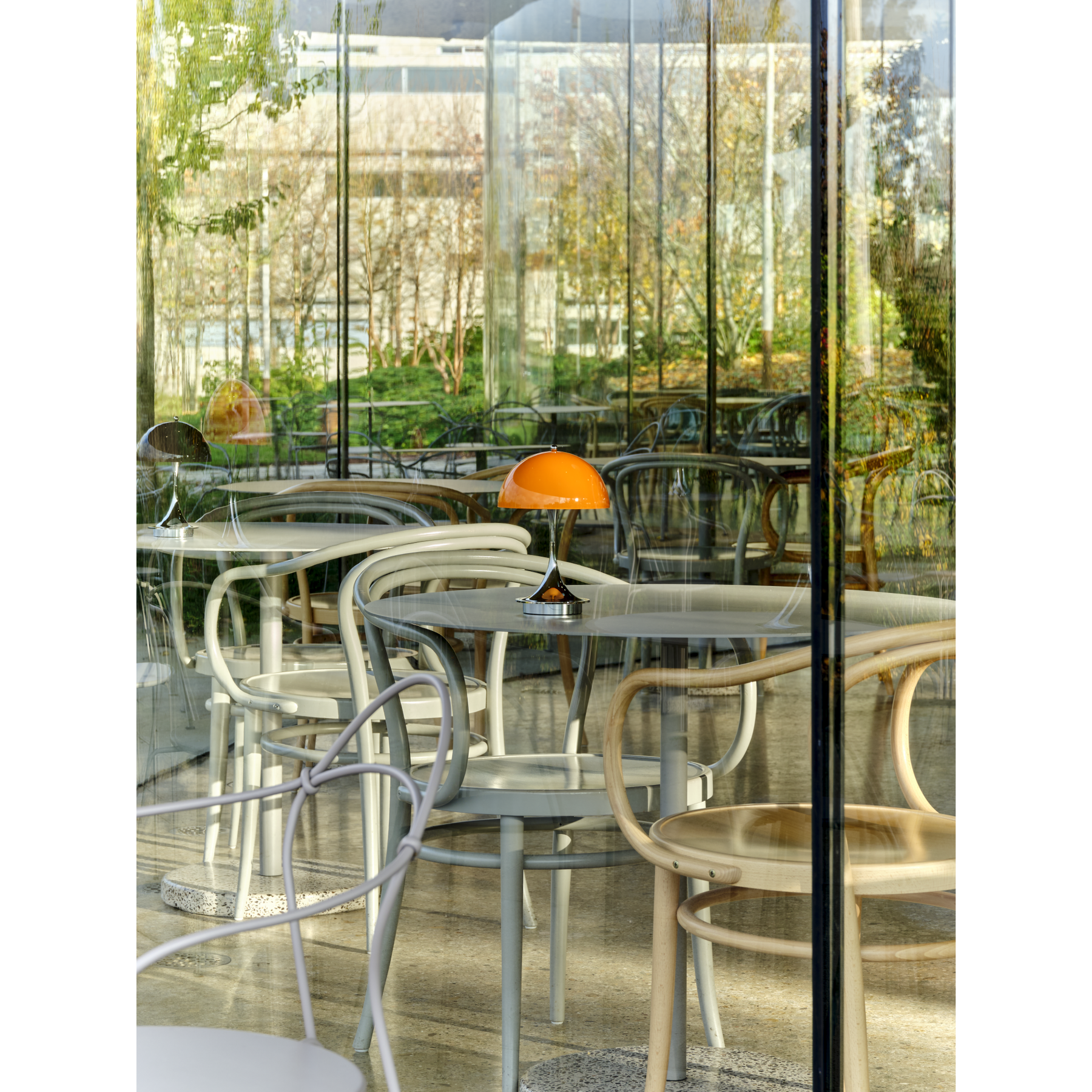 Panthella 160 Portable er udført med skærm og base i sprøjtestøbt polymer i en opal orange finish, som sikrer en jævn, blændfri lysfordeling. Den karakteristiske form — med trompetformet fod og halvkugleformet skærm — reflekterer lyset smukt og skaber en varm, indbydende belysning, som er kendetegnende for Panthella-serien.