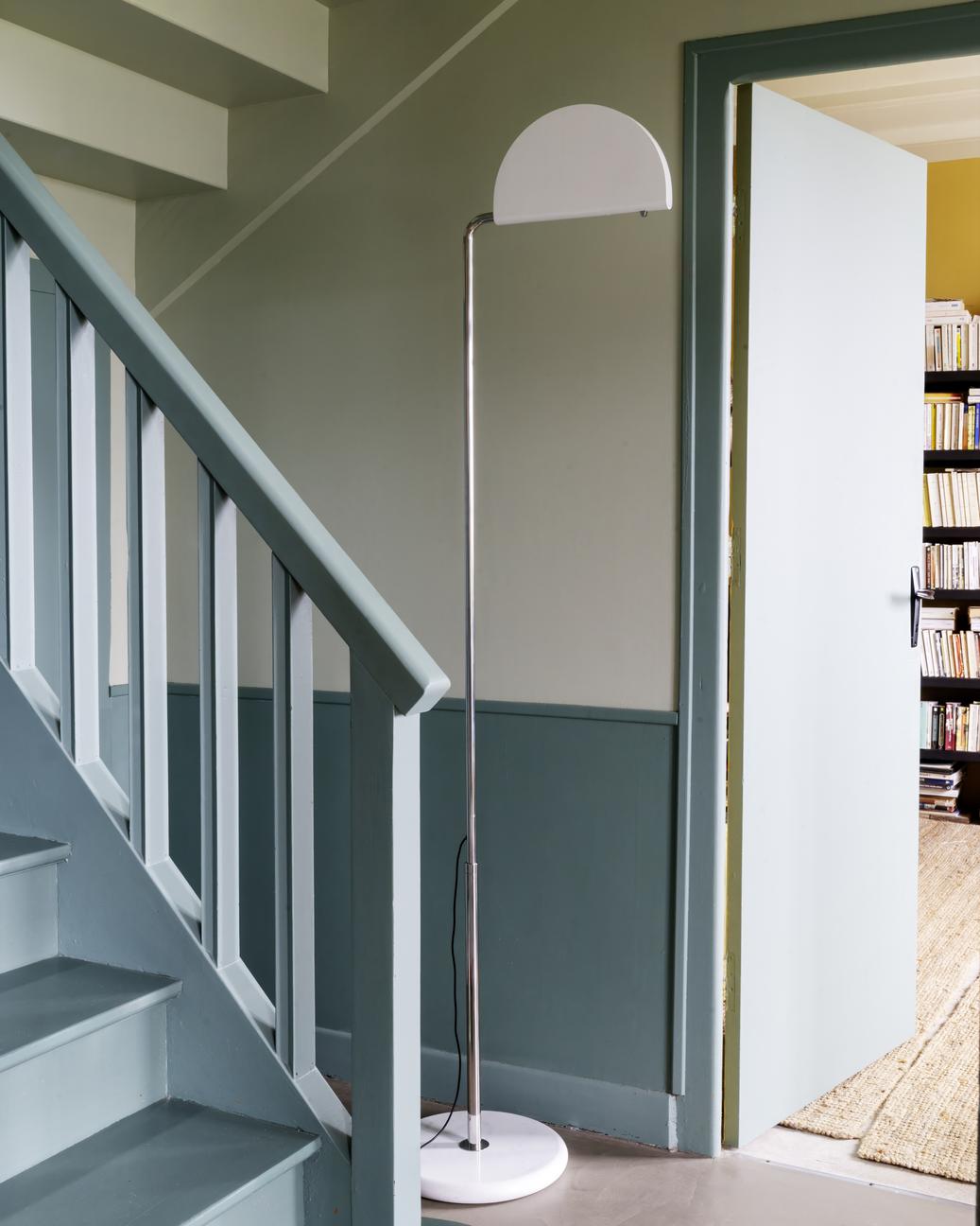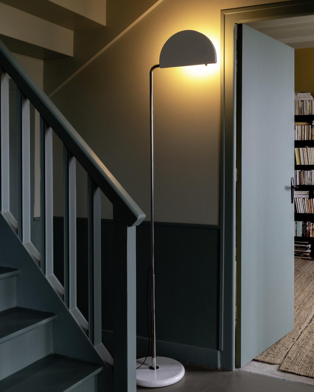 Lampens robuste base i hvid marmor giver både stabilitet og eksklusiv karakter, mens stangen og lampeskærmen i hvid finish bidrager til et grafisk og roligt formsprog. Med en justerbar højde fra ca. 184 cm til ca. 221 cm via det teleskopiske system, og muligheden for at vippe lampeskærmen, giver den både fleksibel placering og funktionel belysning.