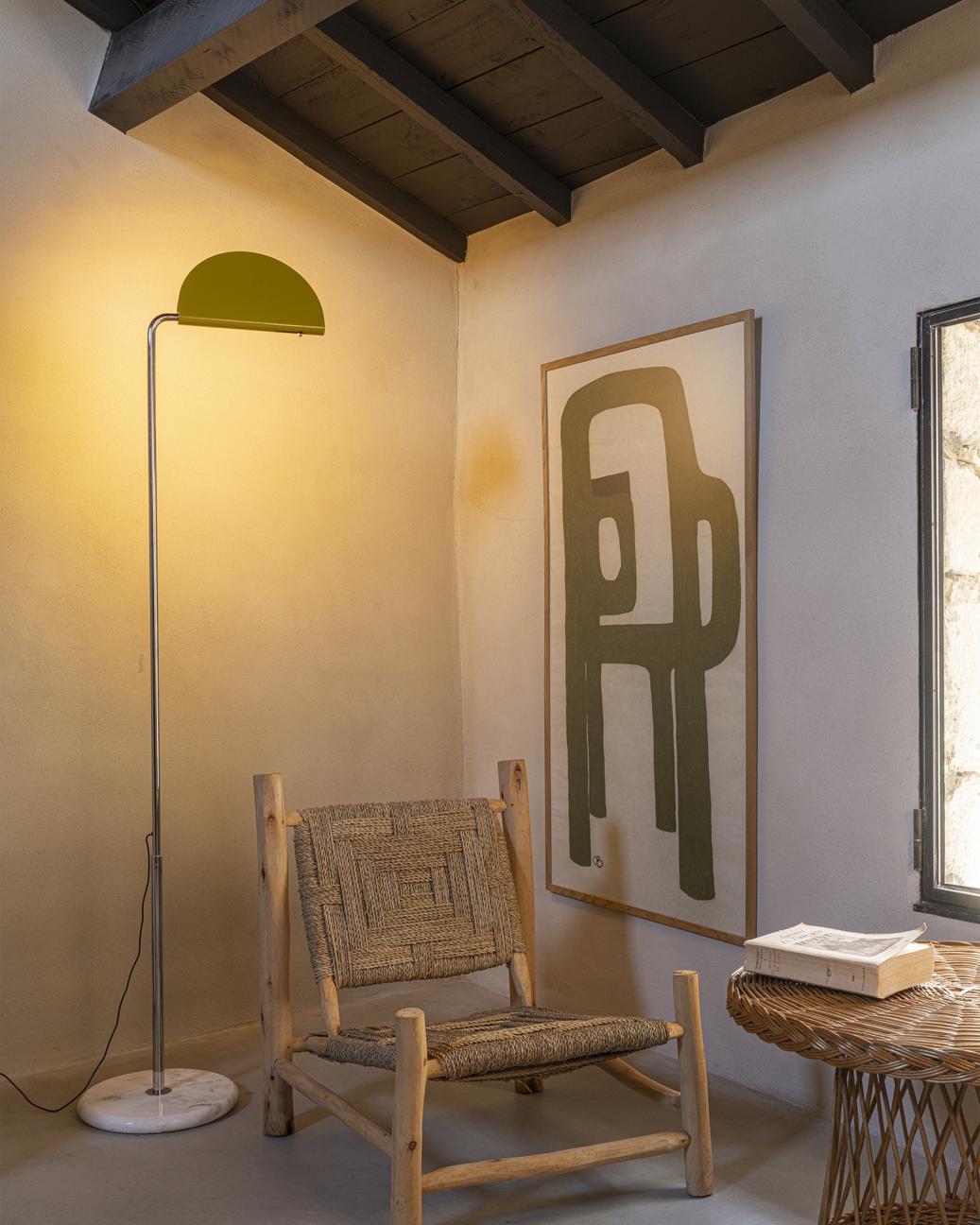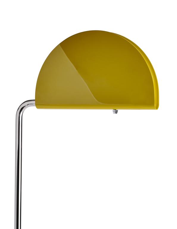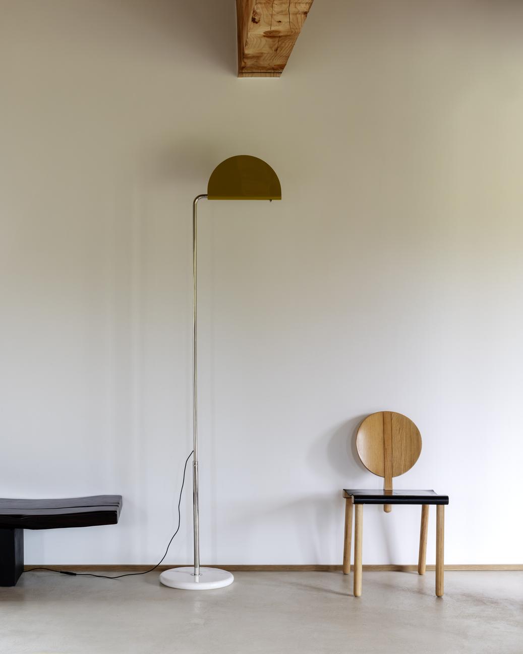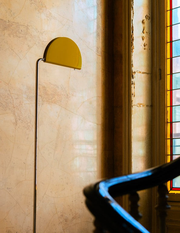 Denne gulvlampe fra DCWéditions er en moderne fortolkning af et designikon – oprindeligt skabt i 1975 af Bruno Gecchelin. Lampen kombinerer en solid hvid marmorfod med en elegant gul skærm og stang i krom eller stål, hvilket giver en visuel kontrast og et farverigt, men stilrent udtryk.