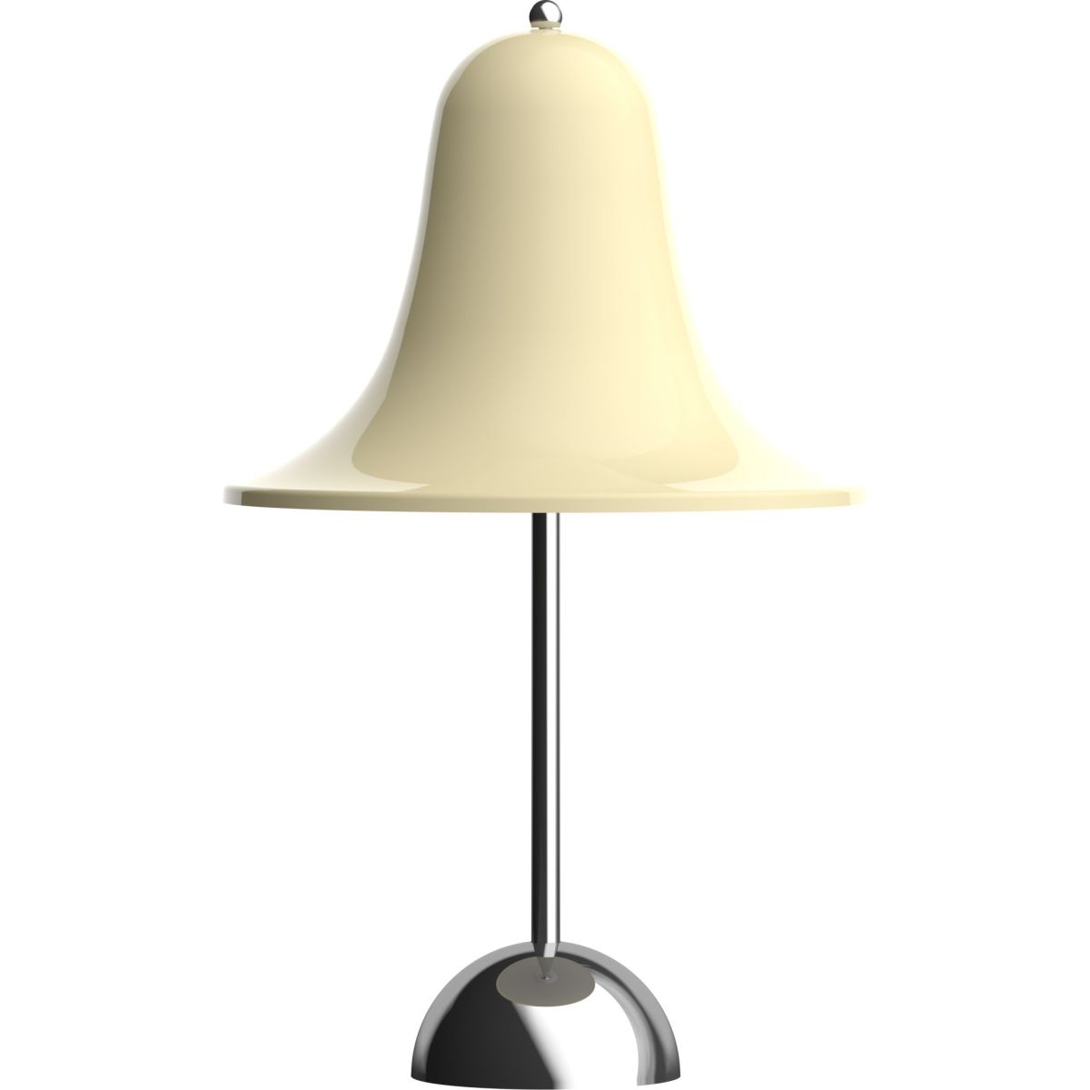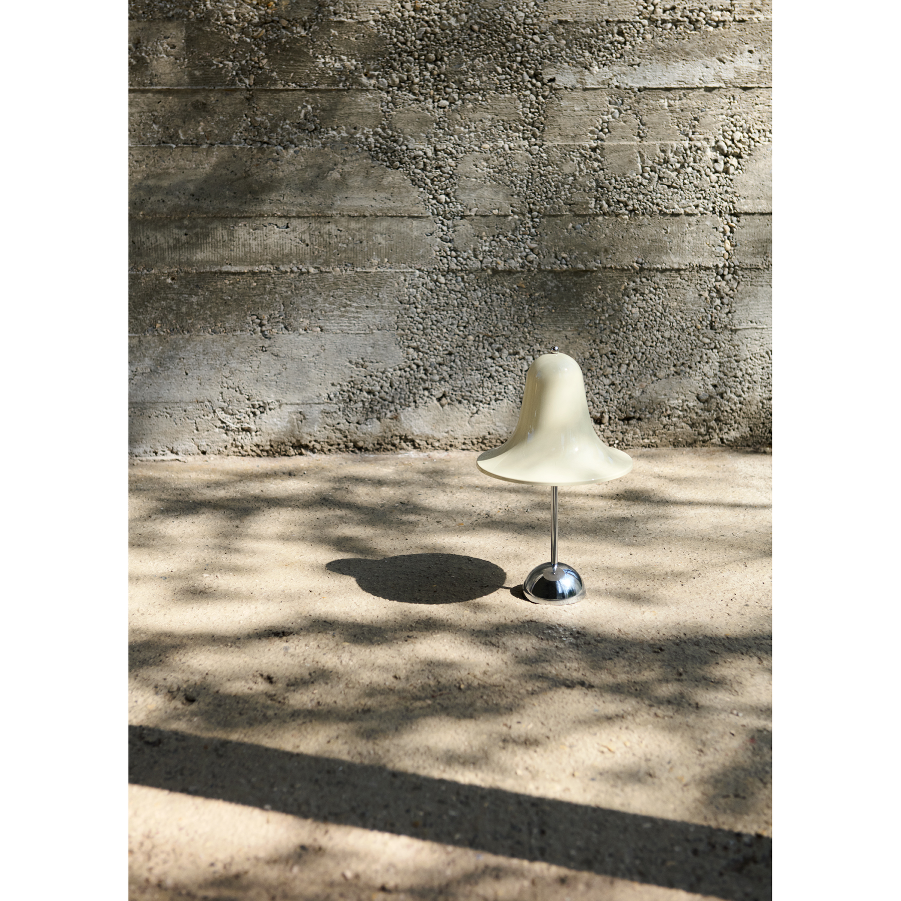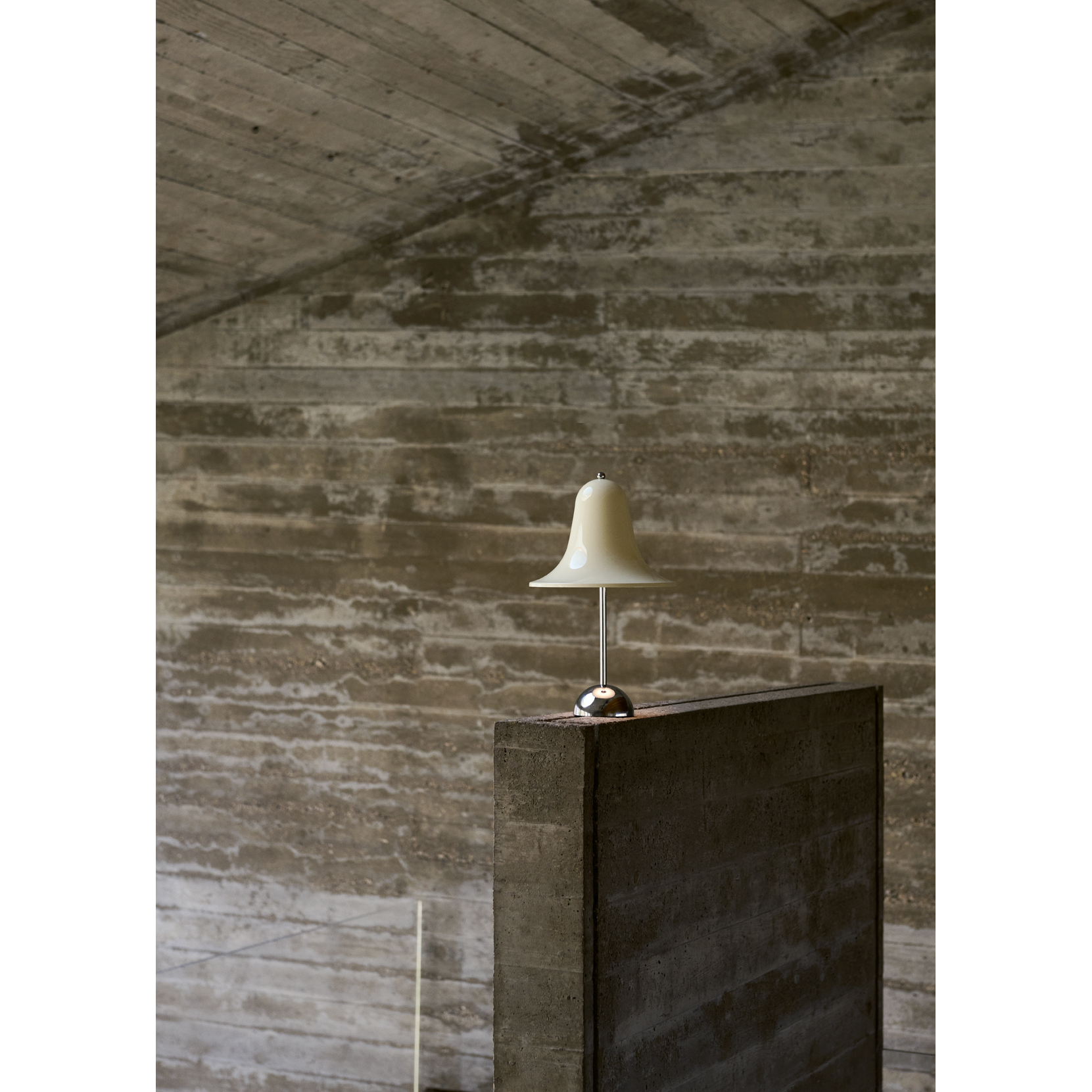 Verpan Pantop Portable i farven Cream White er en stilren og funktionel bordlampe designet af Verner Panton. Den ikoniske klokkeformede skærm spreder et blødt, behageligt lys og skaber en hyggelig atmosfære, uanset hvor lampen placeres.