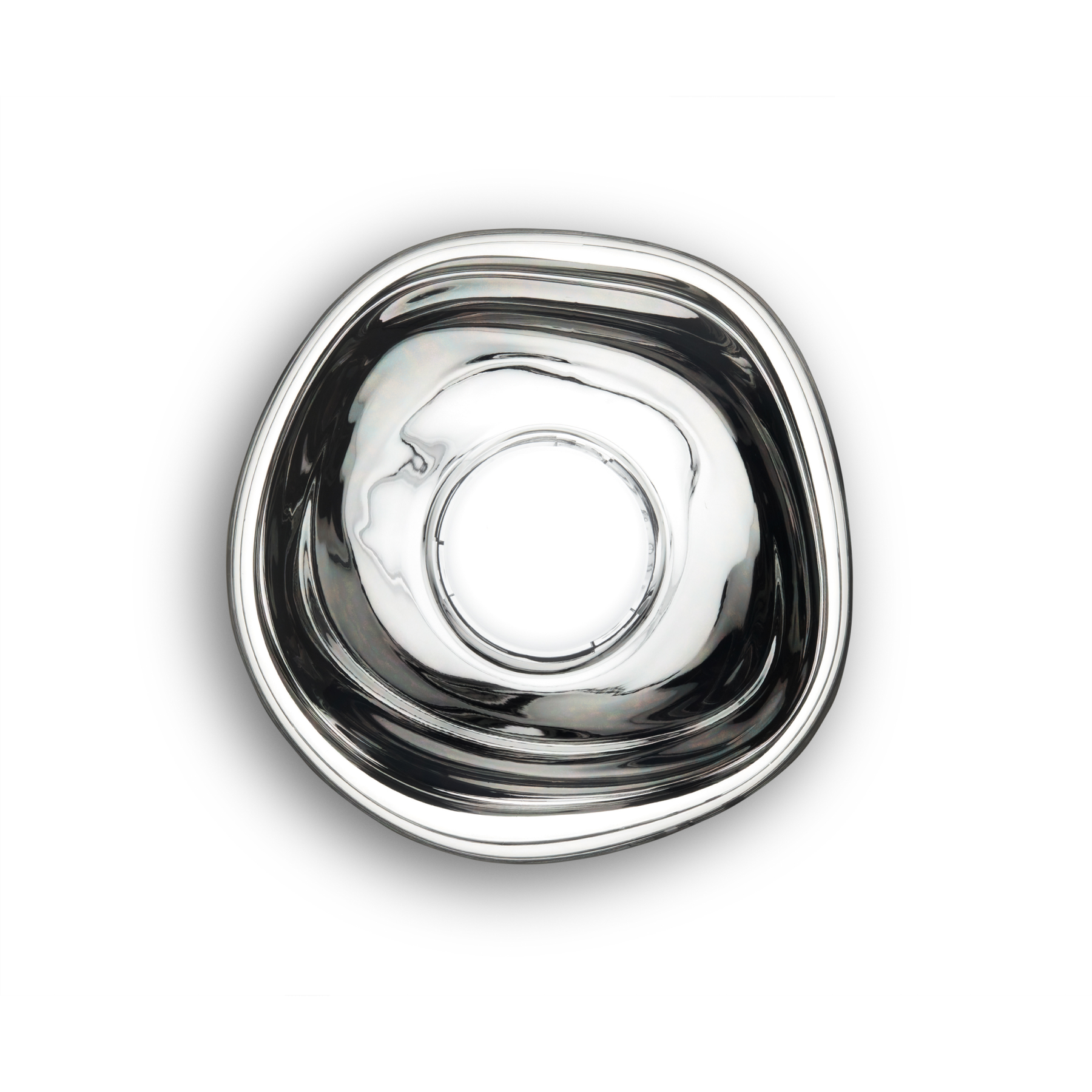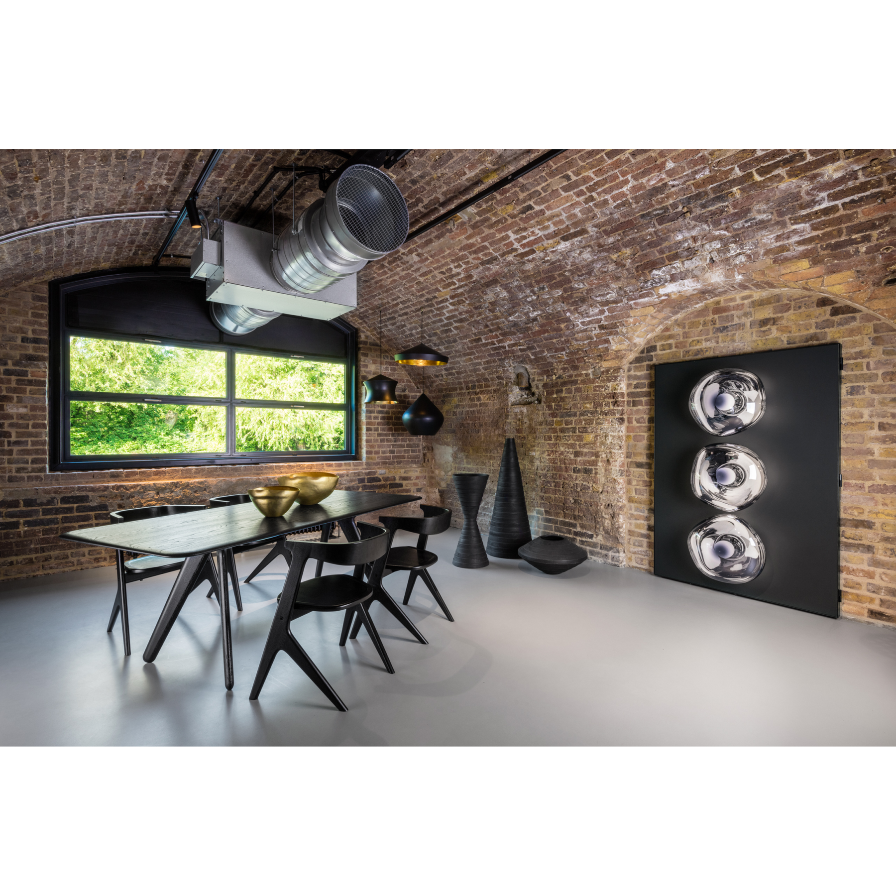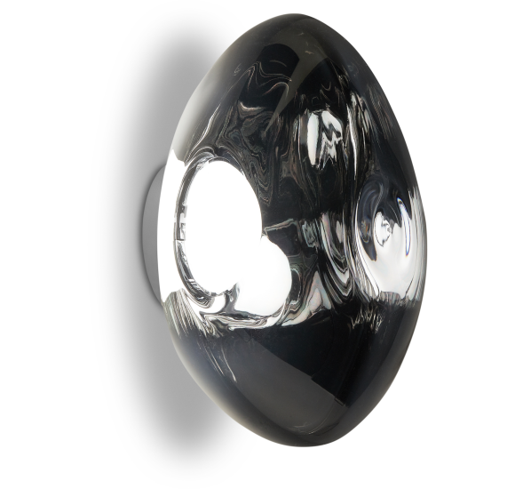 Tom Dixon Melt Surface Silver LED væglampe Ø50 cm kombinerer kunstnerisk design med funktionel belysning. Dens organiske form og spejlblanke overflade skaber et dramatisk udtryk, der både fungerer som kunstværk og lyselement i rummet.