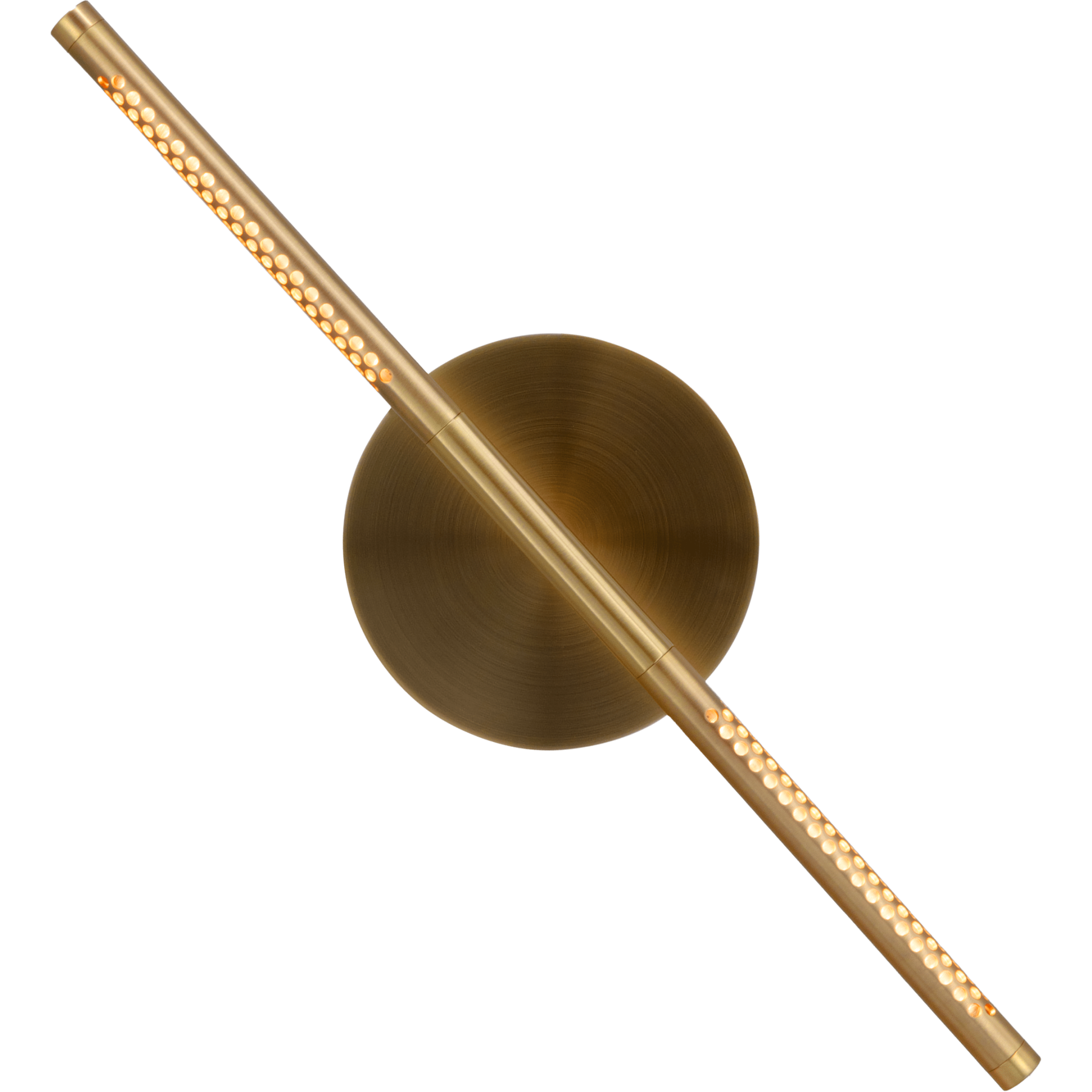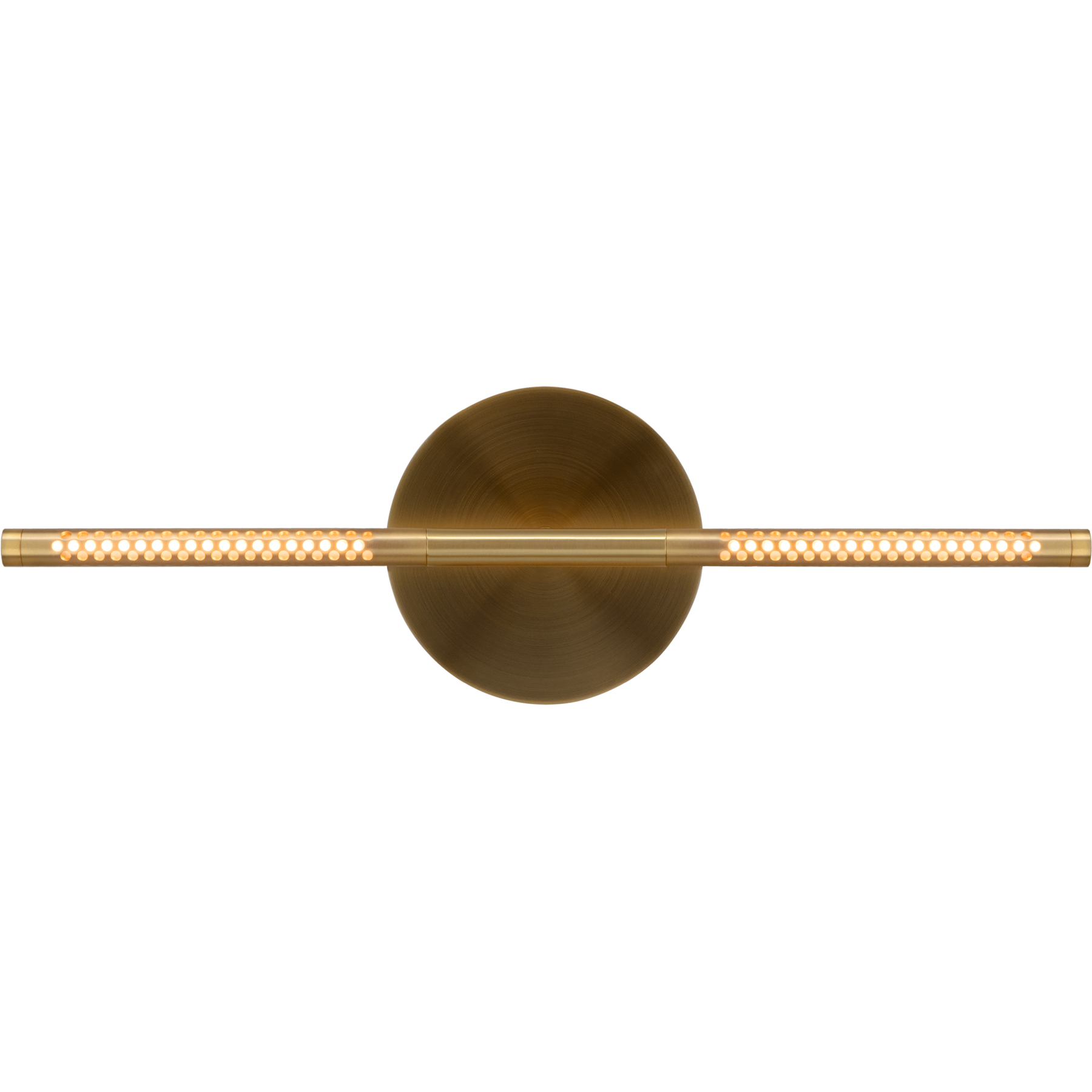 Lampens armatur er fremstillet i aluminium og stål med en varm messingfinish, hvilket giver et tidløst og eksklusivt udtryk. Designet omfatter en bred bredde på ca. 54 cm og en lav profil, der gør lampen ideel til montering på væg uden at dominere rummet.