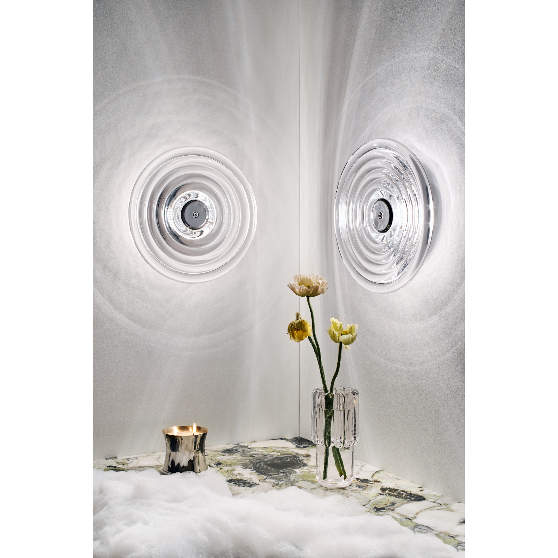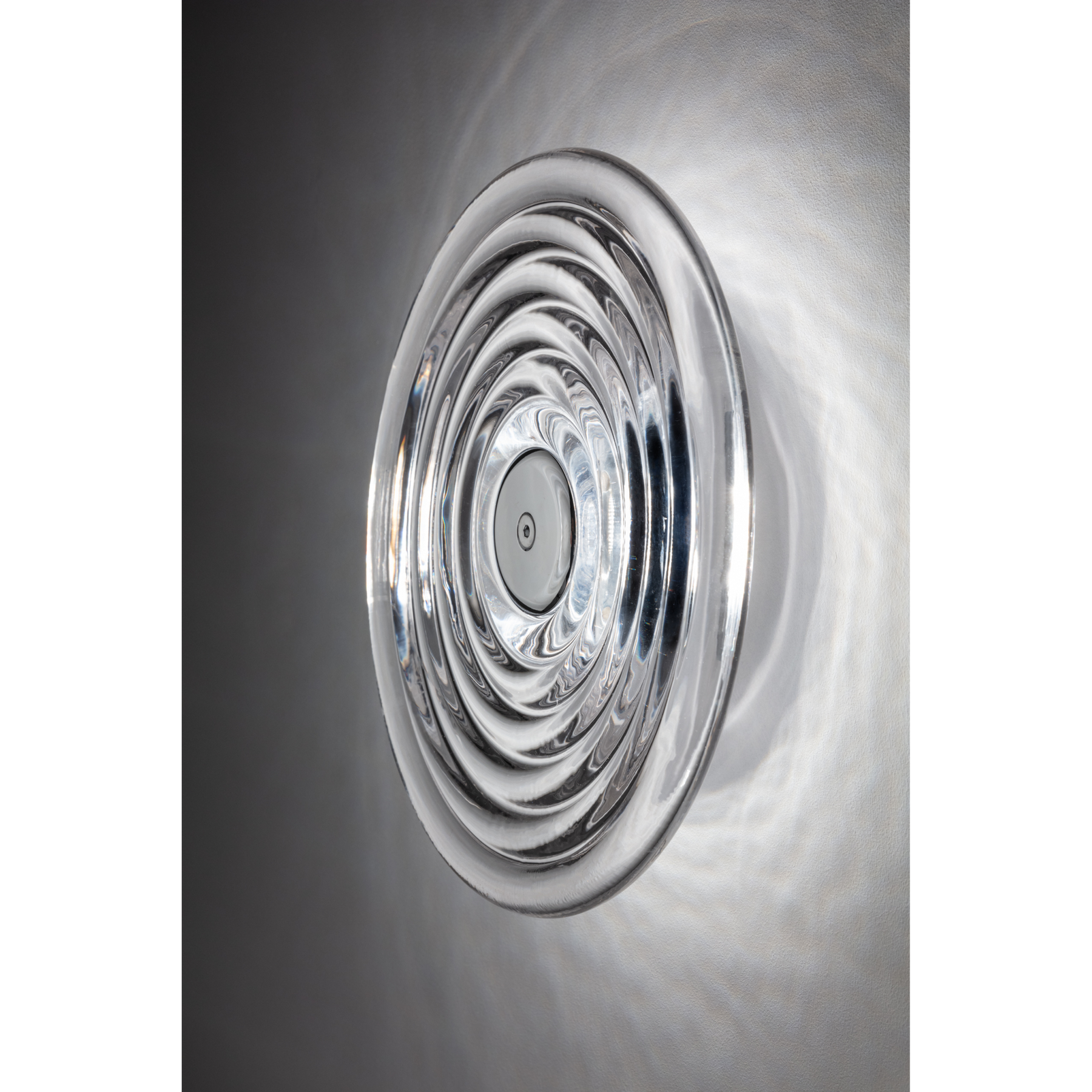 Press Surface Stor Klar LED Væglampe 3000 K er ideel som stemningsbelysning i stuen, gangen, soveværelset eller som dekorativ belysning i badeværelset. Den klare glasstruktur og det varme lys gør den velegnet både alene og i grupper, hvor lyset spiller elegant mellem lamperne.