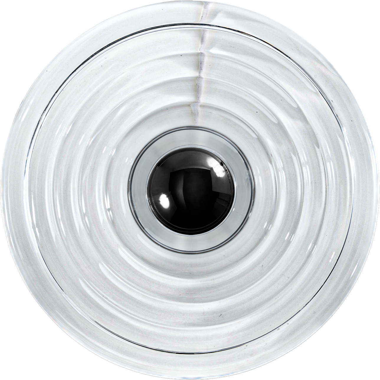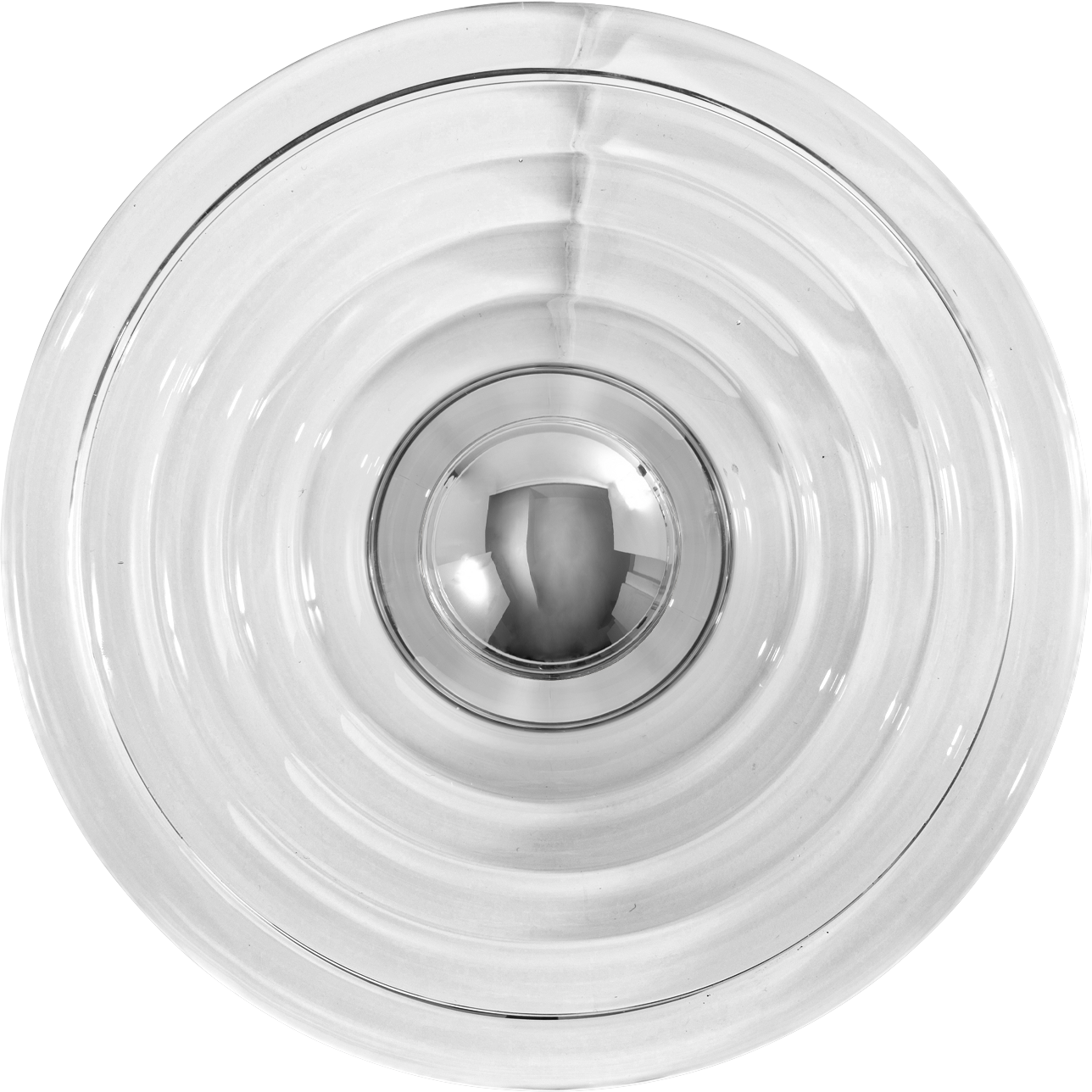 Lampen er fremstillet i massivt, presset klart glas med en ribbet overflade, der bryder lyset og skaber smukke mønstre på væggen. Den runde form og den domede metaltop i enten sølv, guld eller sort tilføjer et luksuriøst touch. Designet er både tidløst og markant, hvilket gør lampen velegnet til forskellige indretningsstile.