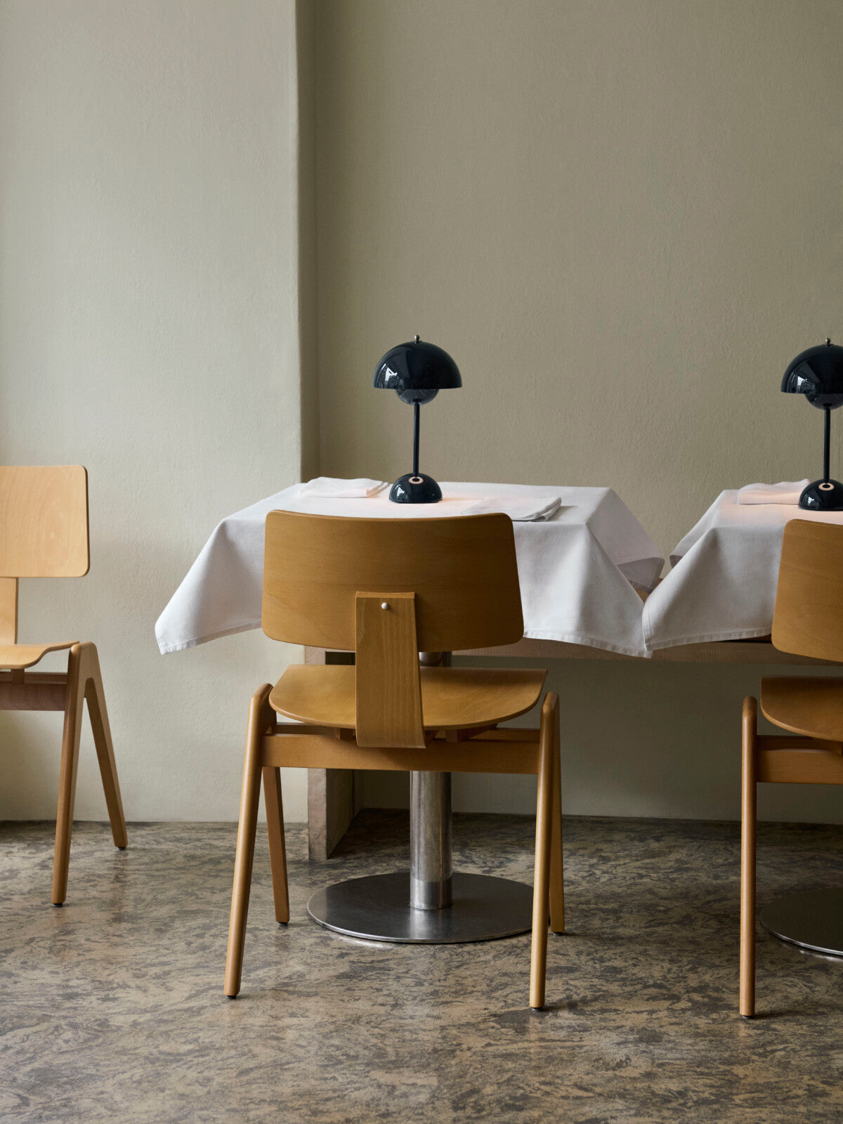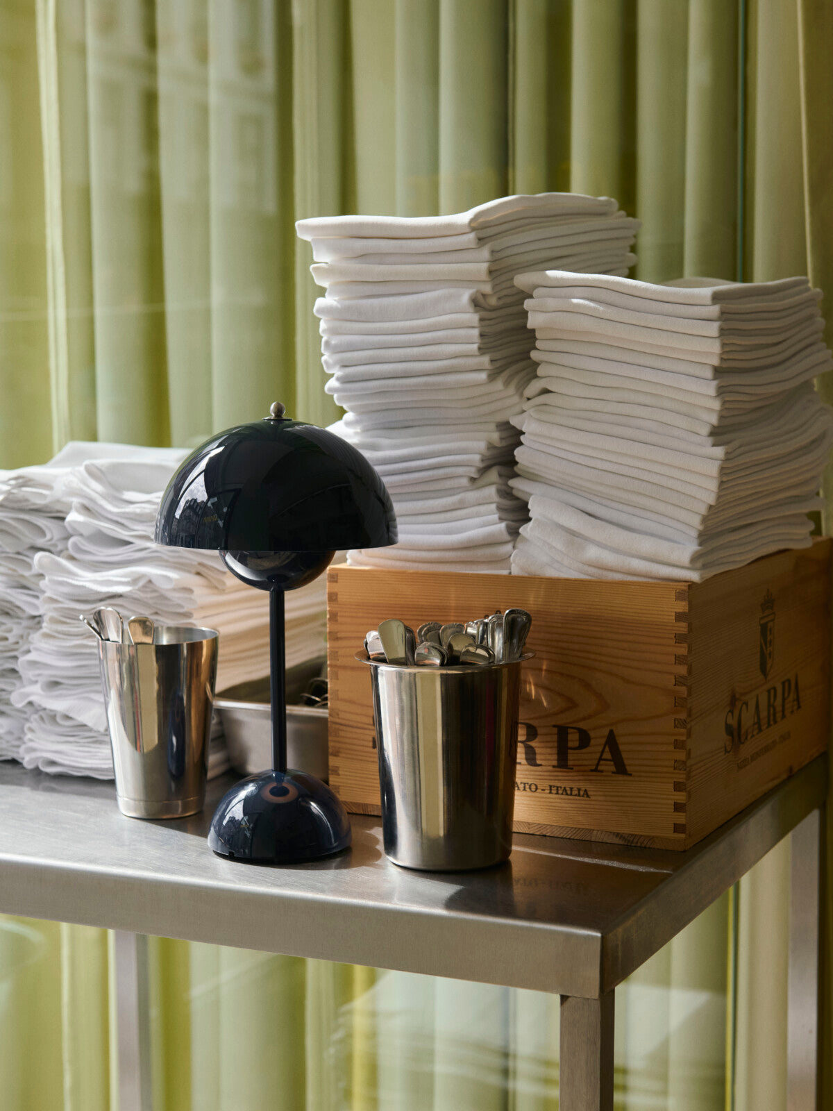 Flowerpot VP9 Portable i Steel Blue er en elegant og bærbar bordlampe fra &Tradition, designet af Verner Panton. Den trådløse lampe bygger videre på det klassiske Flowerpot-design fra VP3, men i en moderne, mobil udgave med indbygget LED-lys og justerbar lysstyrke. Med sit bløde, diffunde lys og kompakte form skaber den stemning og funktionalitet i alle hjemmets rum — fra stue og køkken til altan og terrasse.