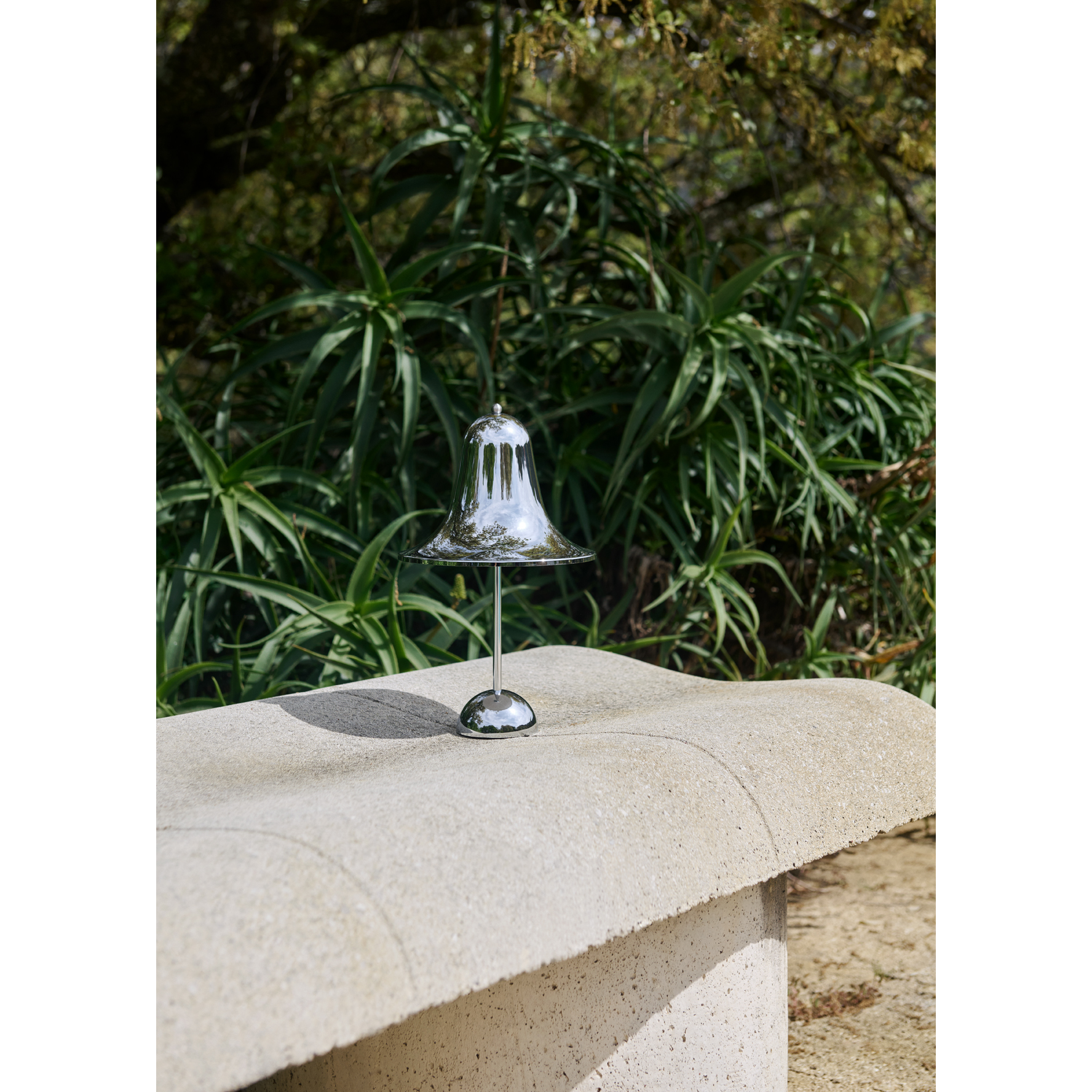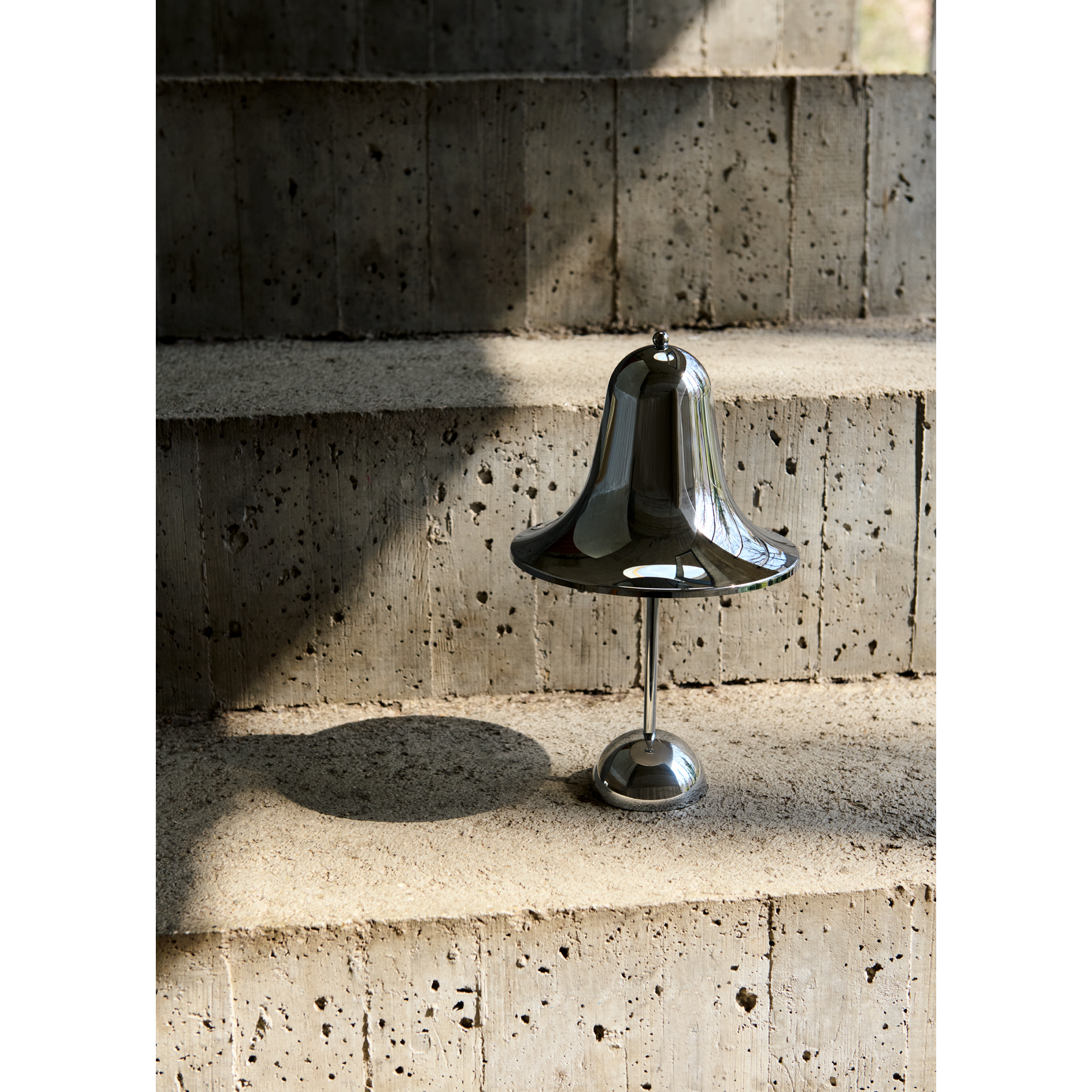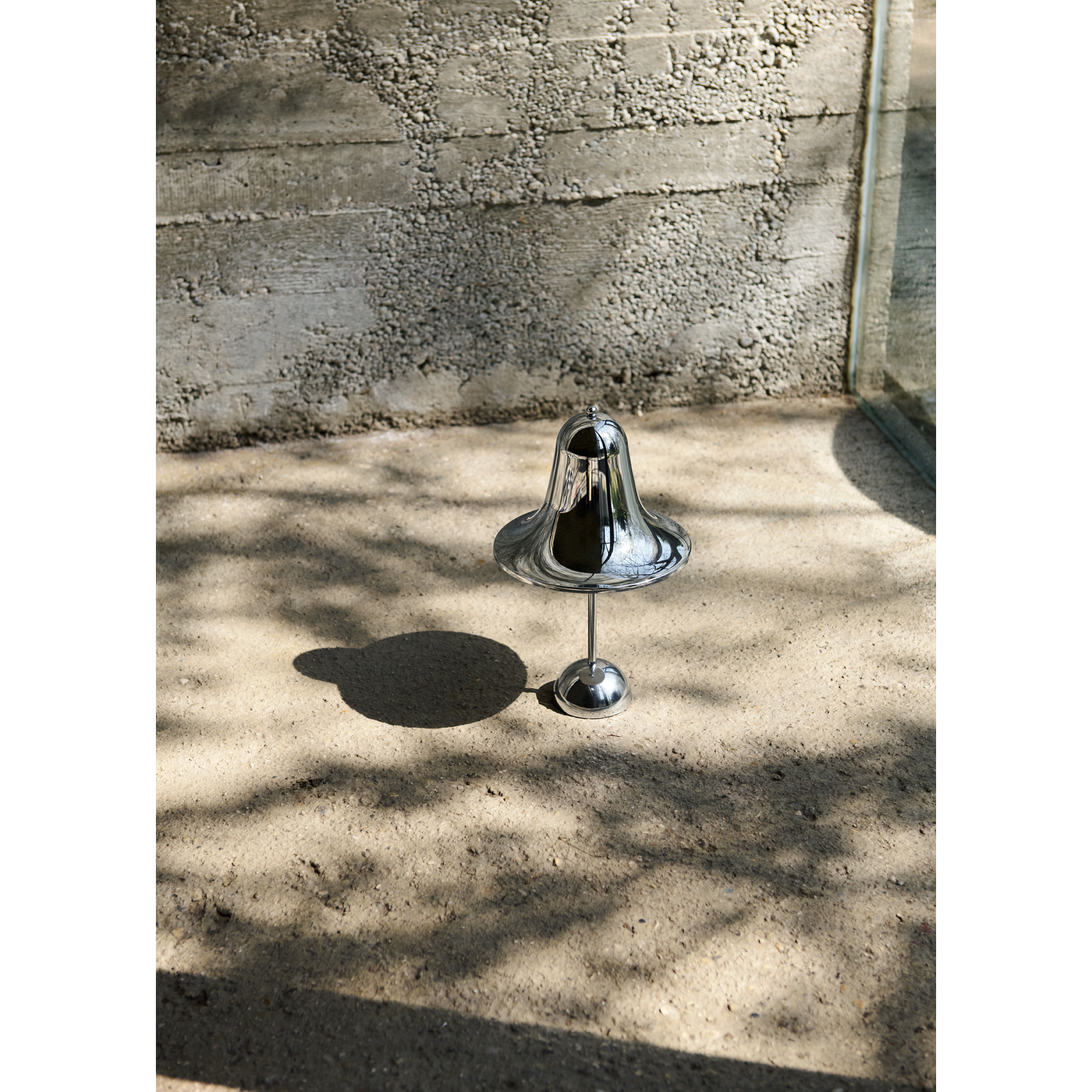 Verpan Pantop Portable Lampe i krom kombinerer Verner Pantons ikoniske klokkeform med bærbar frihed. Den reflekterende overflade og funktionelle bevægelighed giver dig muligheden for at tage lyset med fra rum til rum og skabe stemning præcis, hvor du har brug for det.