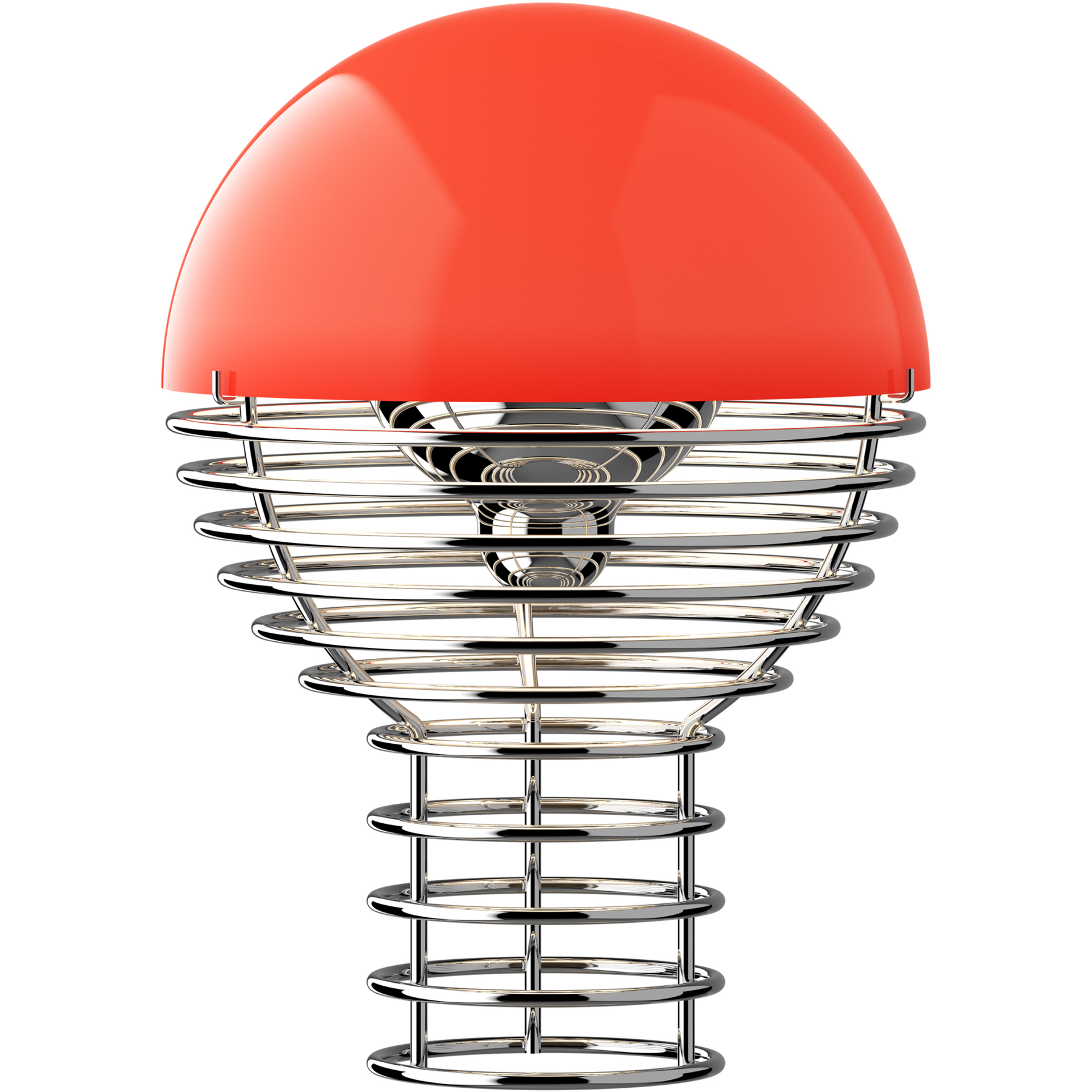 Verpan Wire Portable lampe i rød bringer Verner Pantons legendariske design ind i moderne, fleksible rammer. Dens luftige trådramme og runde kuppel kombinerer ikonisk æstetik med en mobil og brugbar form, der kan flyttes efter behov.